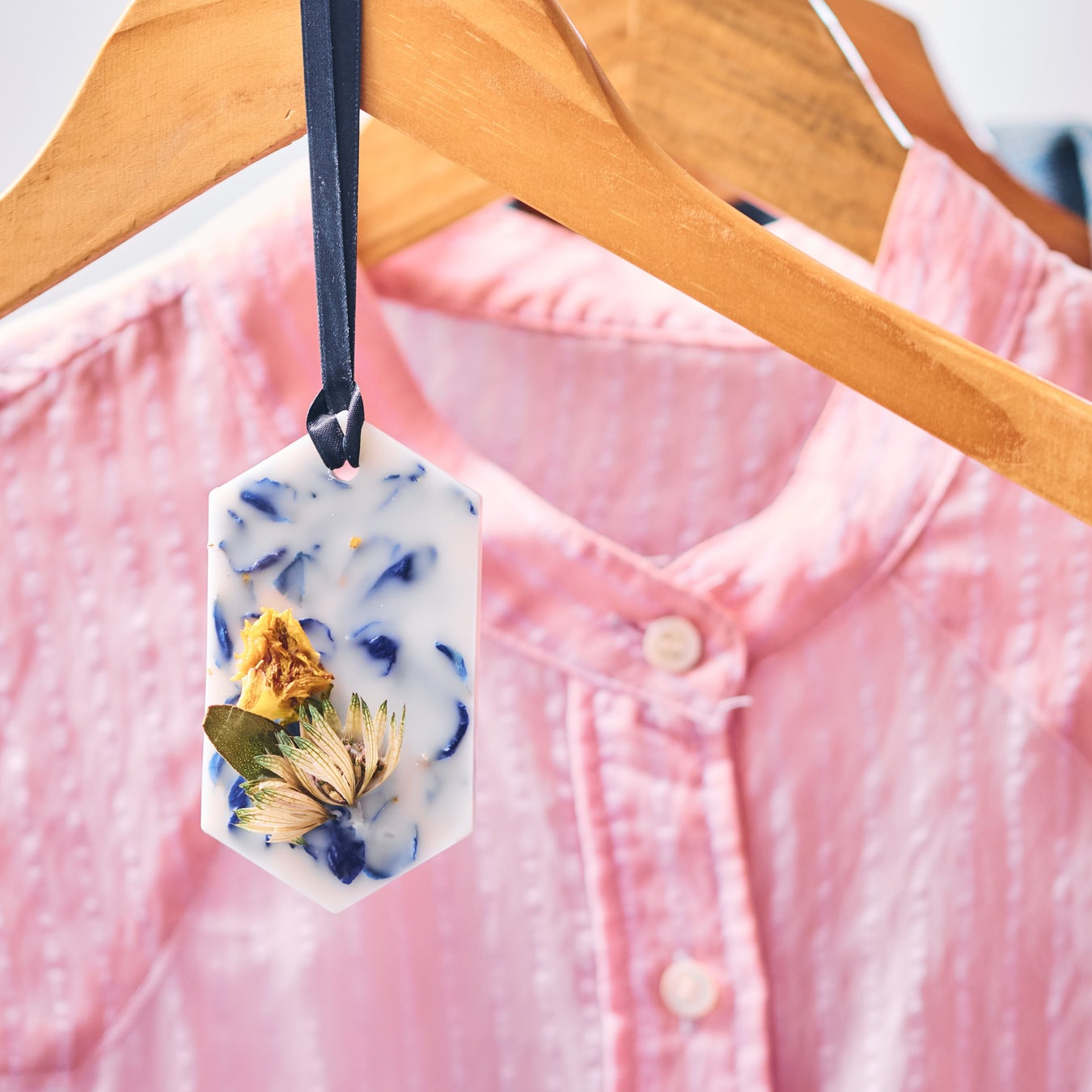 廃棄予定だった花々を加工し、香り豊かなラベンダーの精油でサシェに仕上げました。クローゼットなど生活に取り入れやすいアイテムです。