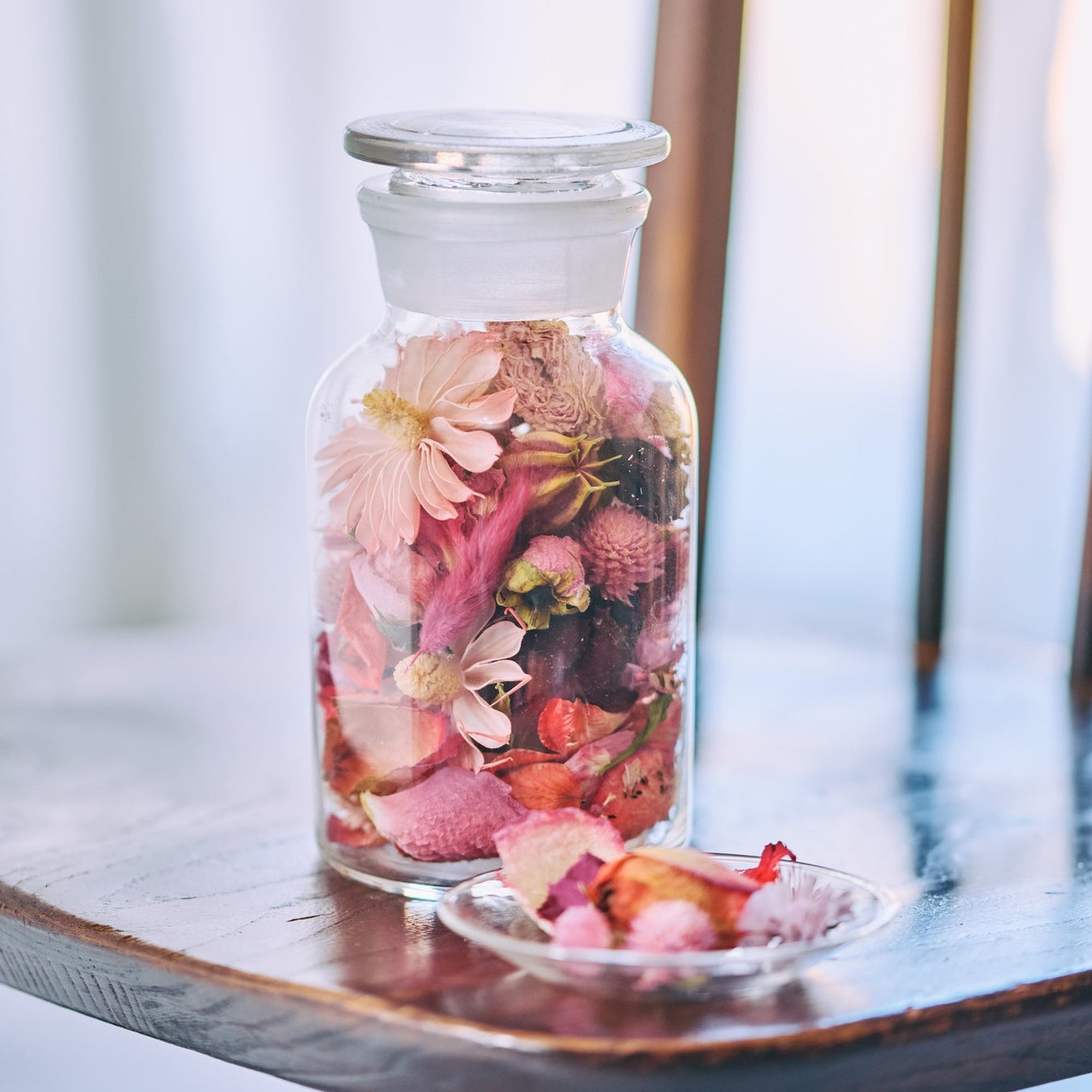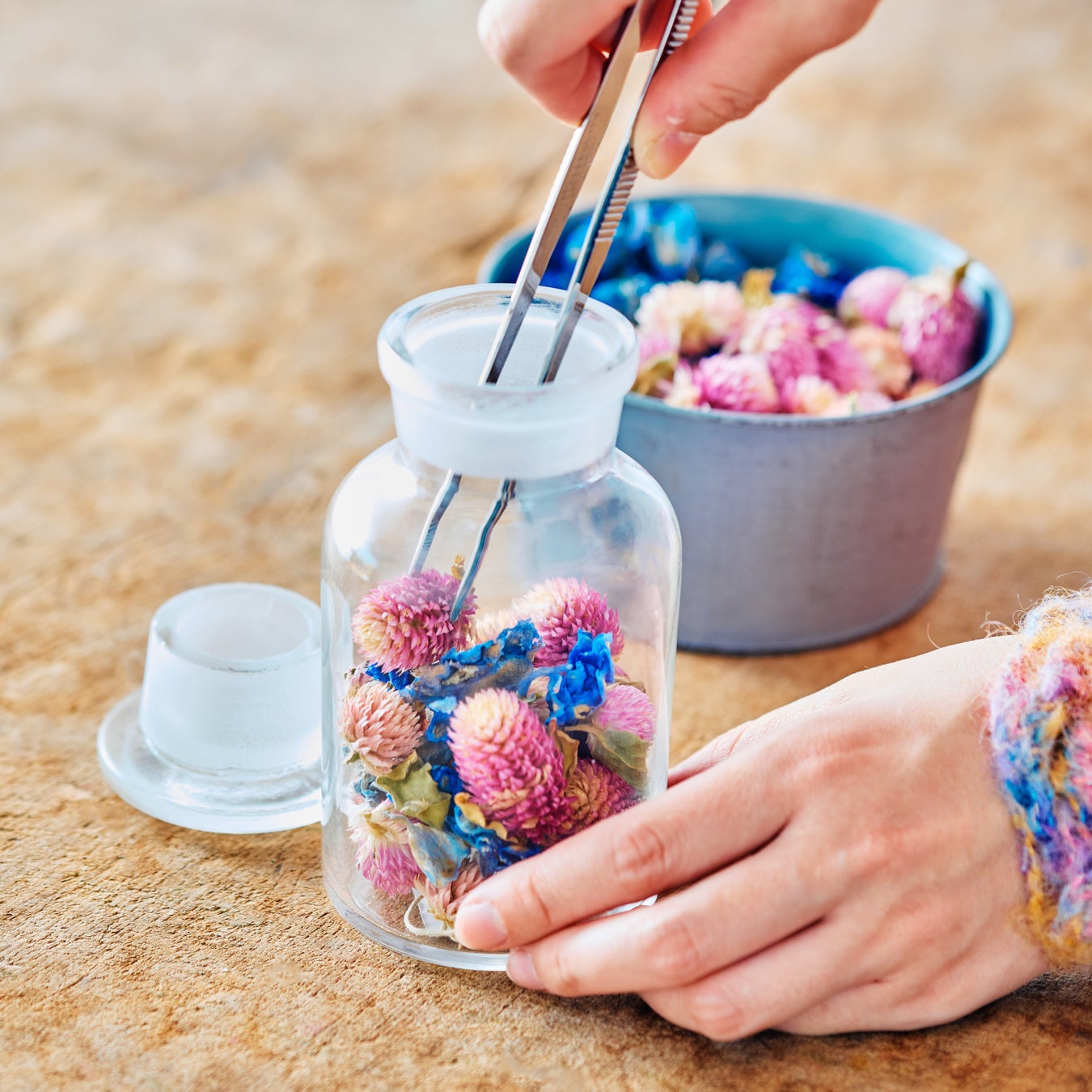 「ロスフラワー®」を瓶詰めして、お好きな香りをつけて完成させるポプリづくり体験。使用する花の種類や配置にこだわりながら楽しめます。