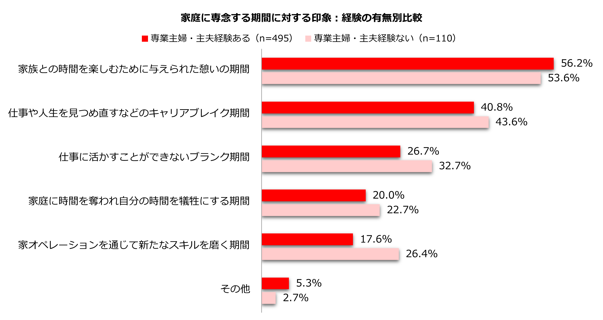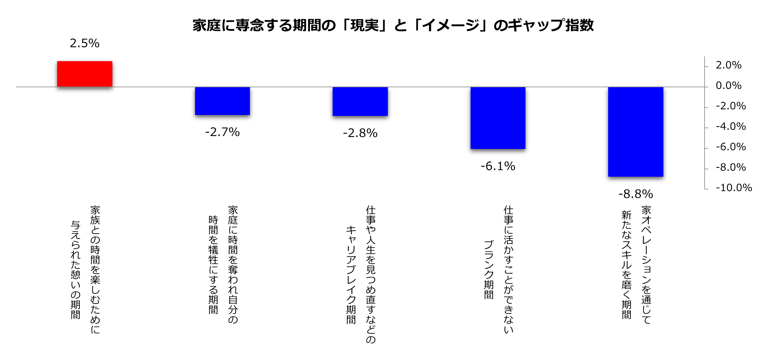 また、「職業キャリアを考えた時、仕事から離れて家庭に専念する期間に対する印象として当てはまるものをお教えください」との質問では、「家族との時間を楽しむために与えられた憩いの期間」のみプラス。マイナスでギャップ最大だったのは「家オペレーションを通じて新たなスキルを磨く期間」の-8.8pts。専業主婦・主夫を経験すると家族と過ごす時間の大切さをより感じる一方、家オペに費やす時間についてはネガティブに捉えてしまう傾向が伺えます。仕事も家オペも生活に不可欠で大切な役割ですが、家オペについては過小評価されがちのようです。家オペ力(※1)を通じて仕事に活かせるソフトスキルも磨かれていることやイエチカ(※2)を評価することの意義に、もっと社会から目が向けられればと願います。