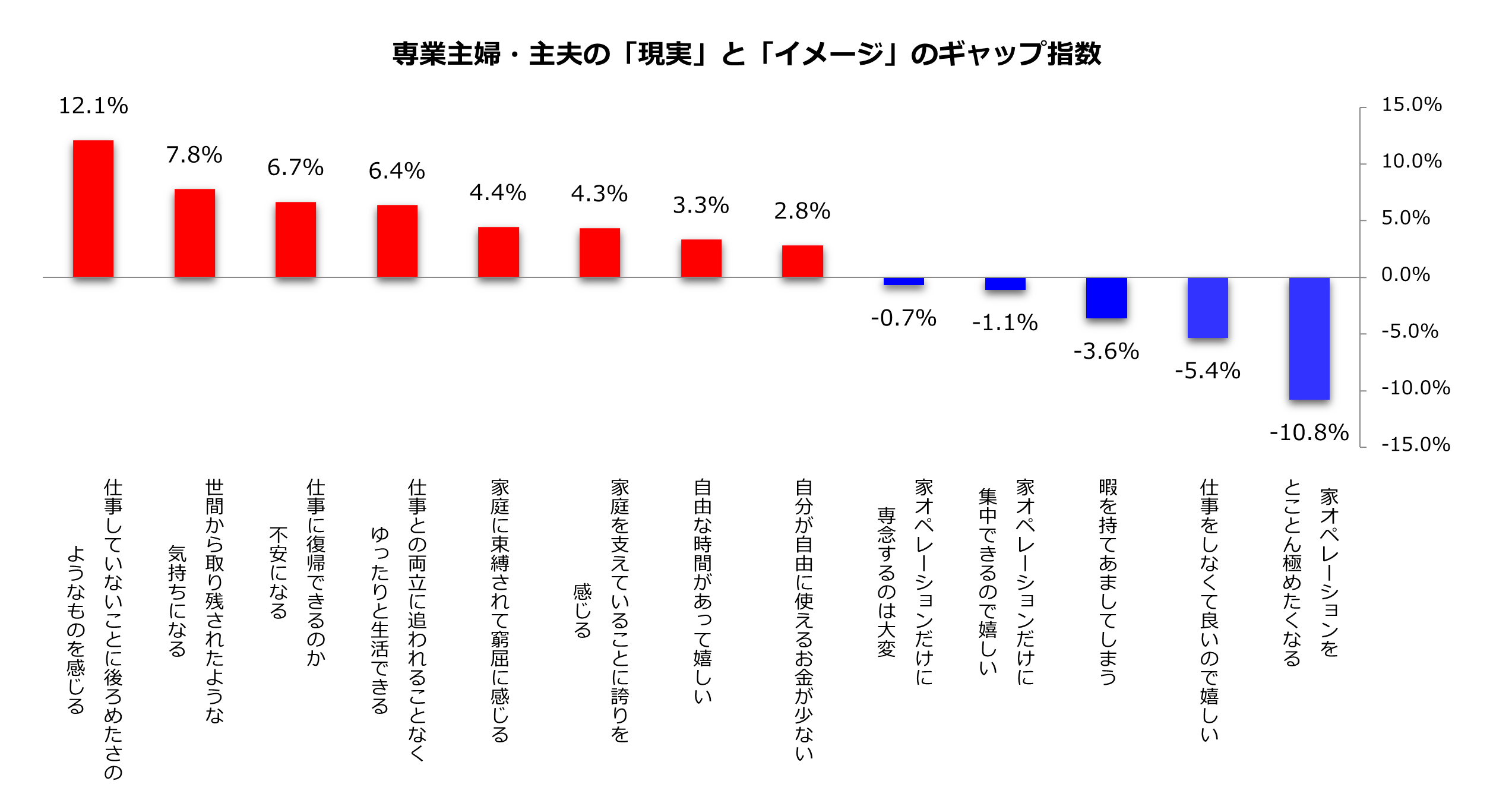 専業主婦・主夫の経験者が実際に感じた“現実”と、経験がない人が受ける“イメージ”に違いが見られた前回の調査結果。そこで、質問の選択項目ごとに、専業主婦・主夫経験が「ある」と答えた人の比率から「ない」と答えた人の比率を引いた値をギャップ指数として算出して再分析しました。「あなたが専業主婦・主夫になった場合の気持ちとして、当てはまると思うものをお教えください」との質問で最もギャップのプラスが大きかった回答は「仕事していないことに後ろめたさのようなものを感じる」で12.1pts。一方、ギャップのマイナスが最大だったのは「家オペレーションをとことん極めたくなる」で-10.8pts。実際に専業主婦・主夫を経験すると後ろめたさのような気持ちを抱いてしまいやすい半面、家オペレーション(家オペ)に対する積極的な気持ちは感じにくくなってしまうようです。