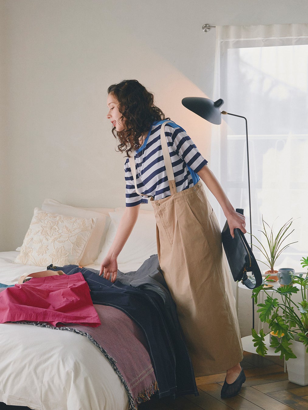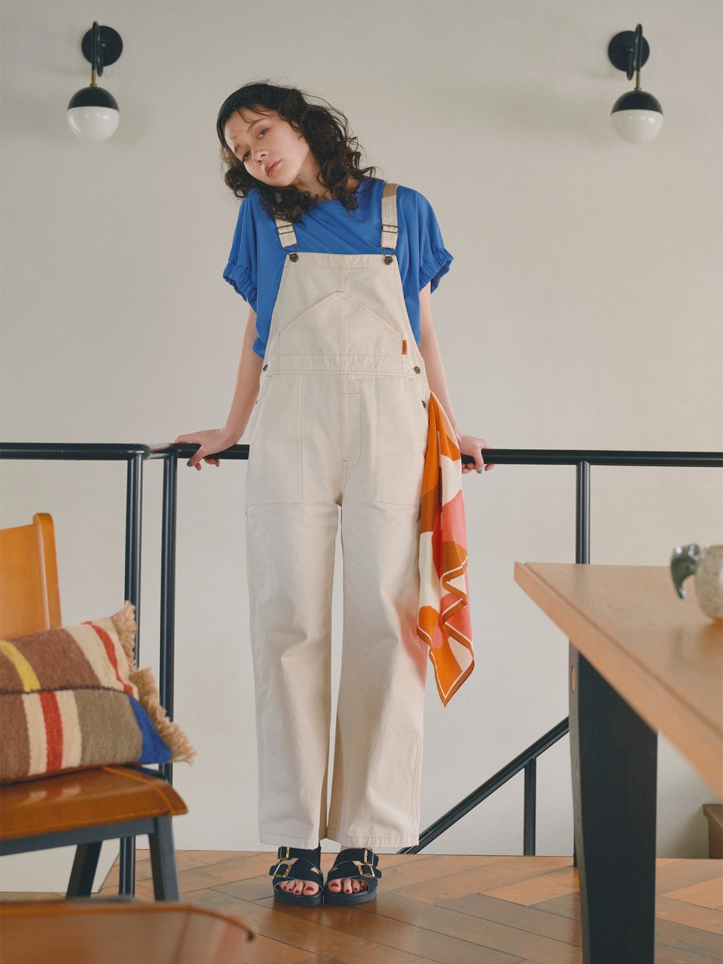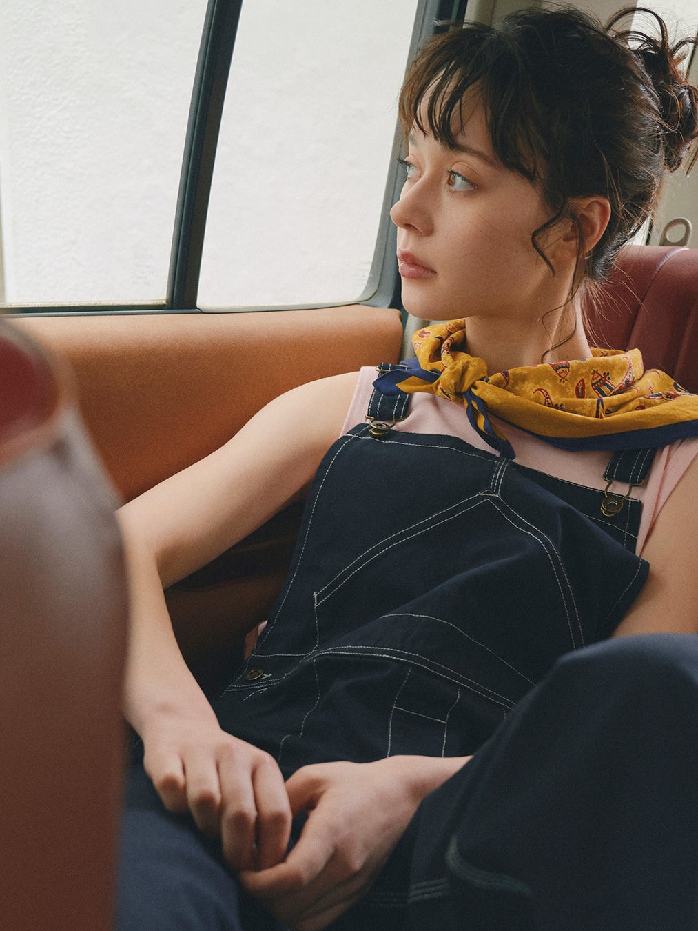 初のコラボレーションは、リラックス気分で着こなせるジャンパースカートとサロペットの2種類を別注しました。ユニバーサルオーバーオールのならではのカジュアルなデザインに、大人の女性が着用しやすいようにヒューマンウーマンらしくアレンジを加えた、特別なアイテムです。