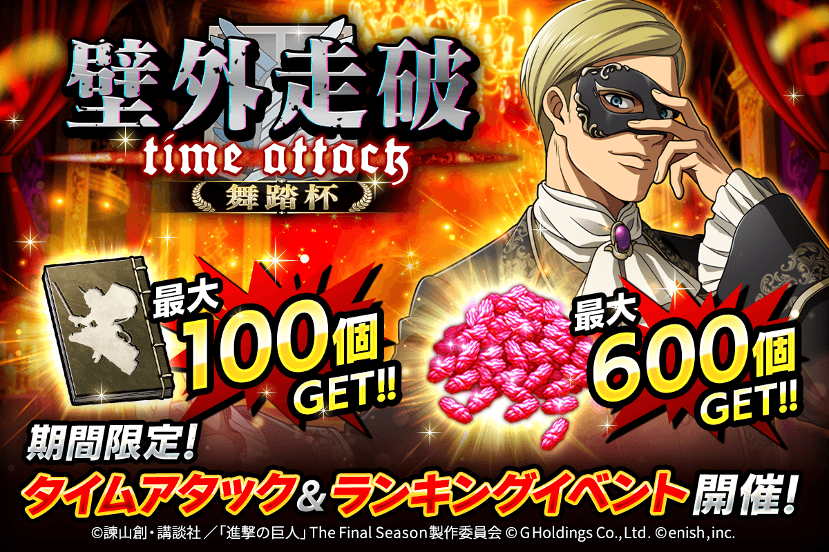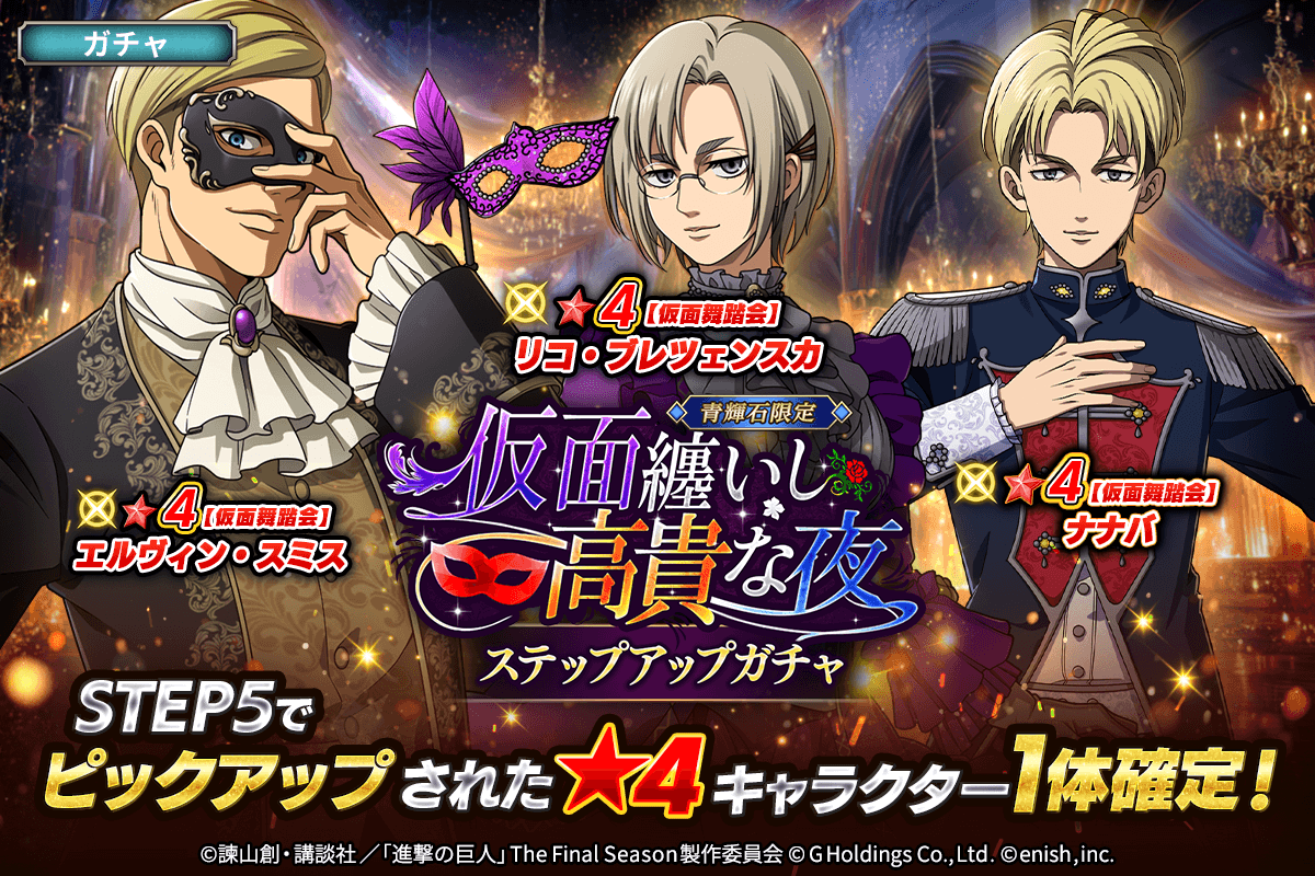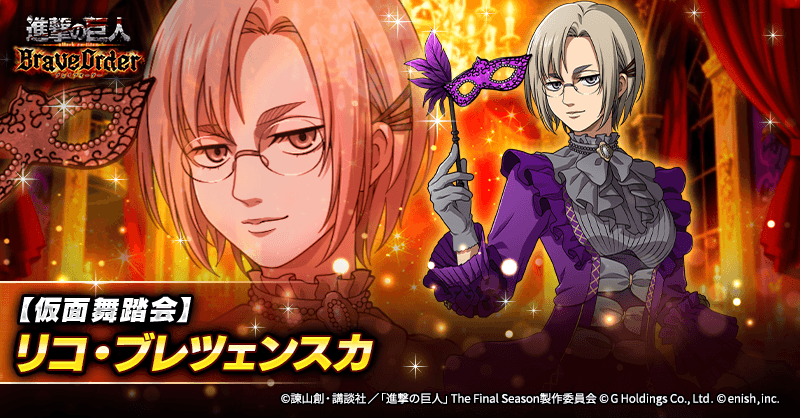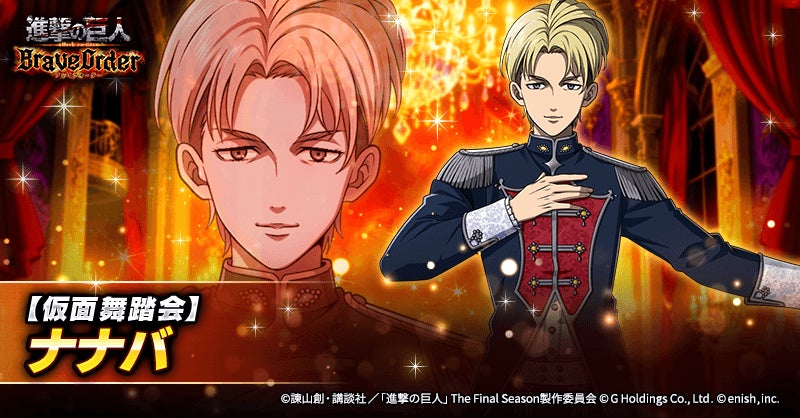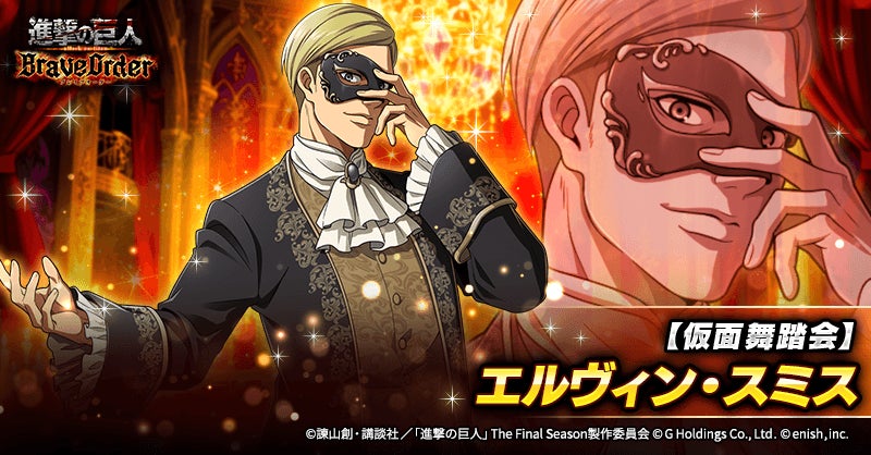 株式会社enish(本社:東京都港区、代表取締役社長:安徳 孝平、以下enish)は、アニメ『進撃の巨人』のスマートフォンゲーム最新作「進撃の巨人Brave Order」にて、2026年3月27日(金)より、新イベントの仮面纏いし高貴な夜を開催!また、本日より【仮面舞踏会】エルヴィン・スミス、【仮面舞踏会】リコ・ブレツェンスカ、【仮面舞踏会】ナナバが登場する「仮面纏いし高貴な夜ガチャ」も開催!その他、最新情報はゲーム公式サイト・ゲーム公式X(旧Twitter)アカウントにて随時公開して行きますので、ぜひご覧ください。