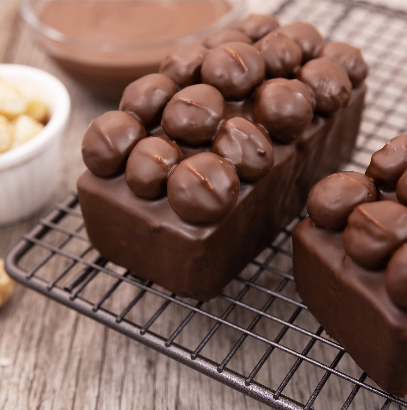 チョコチップ入りのパウンドケーキに、塩味をきかせてローストしたマカダミアナッツを贅沢にのせ、チョコでコーティングしました。