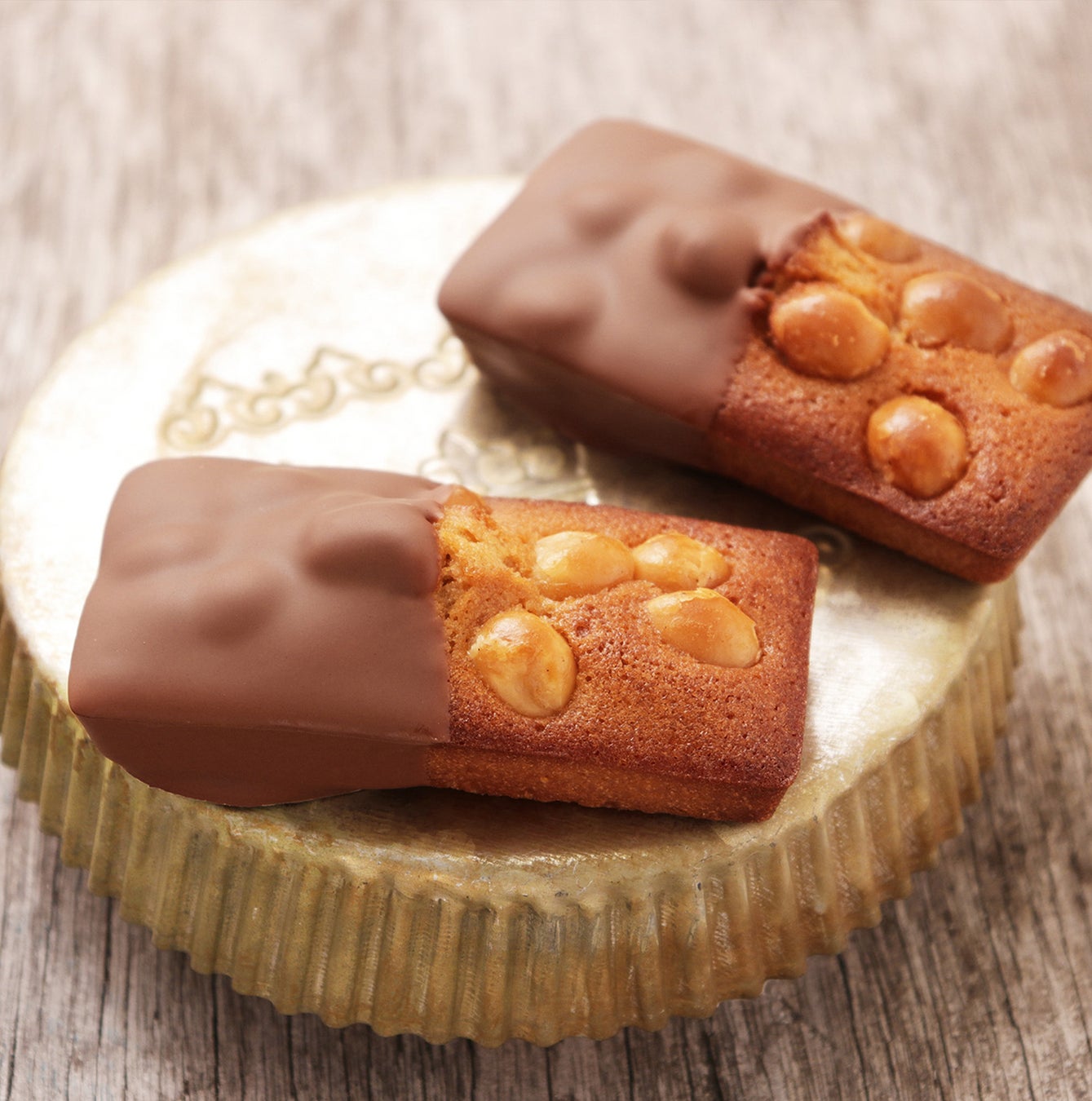 スペイン産マルコナ種のアーモンドプードル、溶かしバター、きび糖にベルギー産ミルクチョコレートを加え、香ばしく焼き上げました。チョコチップとヘーゼルナッツをトッピング。フィナンシェ生地に、ほんのりゲランドの塩を加え、味に深みを出しています。