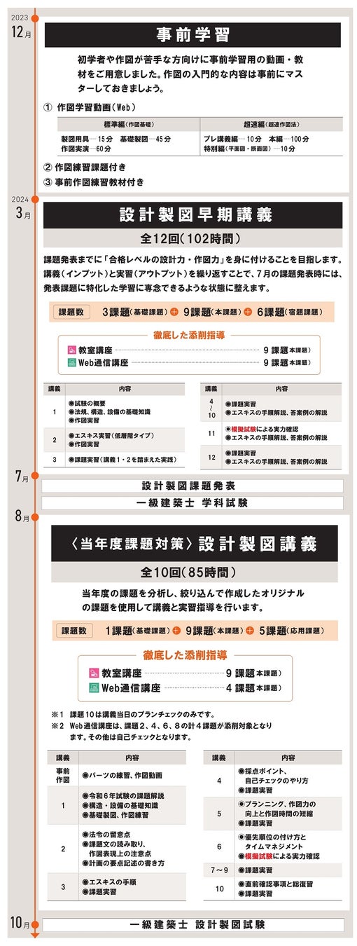 当コースは「(課題発表前の)設計製図早期講義」全12回、「(当年度課題対策)設計製図講義」全10回をパッケージしたコースです。「設計製図早期講義」は校舎により、開講していない場合がございます。開講していない校舎につきましては、Web通信等でのご受講となります。