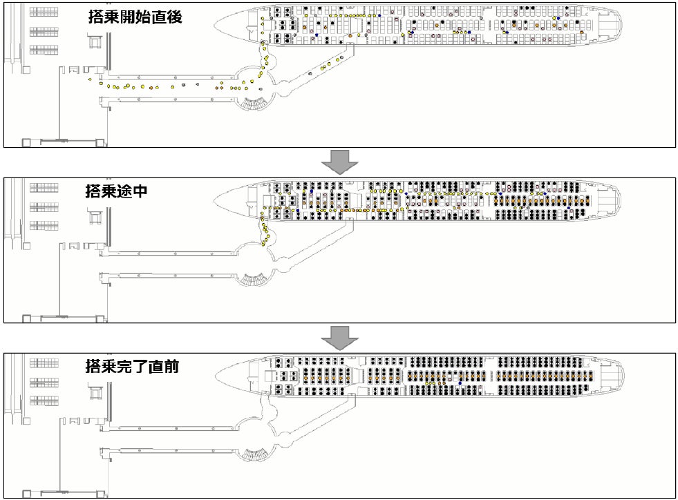 今回の研究結果による搭乗方法をワイドボディ機材に導入することにより、現在の搭乗方法に比べ機内混雑が緩和され、所要時間の短縮が期待されます。