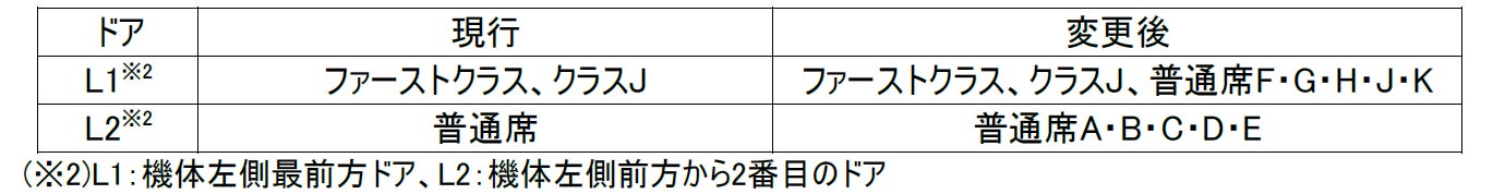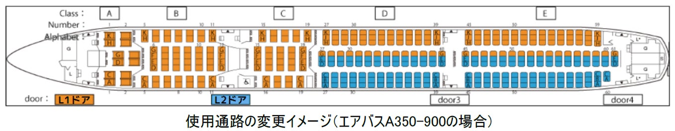 4として前方座席(青色部分)を含むすべてのお客さまにご搭乗いただく方式に変更し、ワイドボディ機材におい