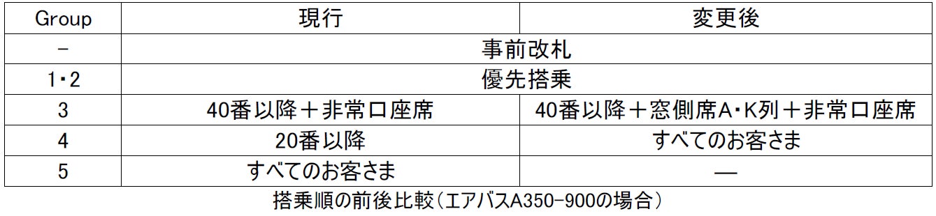 てGroup5は廃止します。なお、事前改札と優先搭乗はこれまでと変更はございません。
