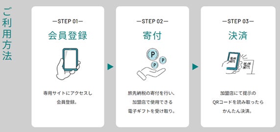 株式会社ギフティが提供する「旅先納税®」は、旅行・出張で訪れた自治体にスマートフォン上でふるさと納税ができ、返礼品として加盟店の宿泊施設や飲食店、レジャー施設、みやげ物店などで使える電子商品券を受け取れる取り組みです。寄附はスマートフォンで簡単にでき、電子商品券はその場で発行されるので、旅先ですぐに使用することができます。
