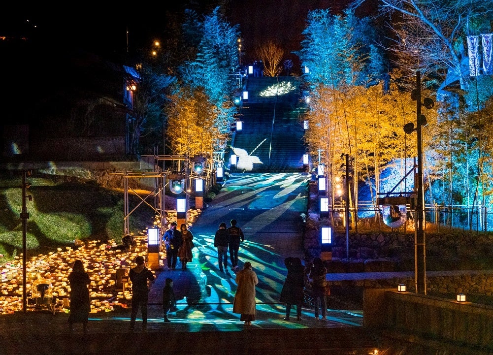 温泉街を流れる音信川を舞台に、長門市出身の童謡詩人金子みすゞの詩をテーマに織りなす幻想的な光の空間を演出するイベント。詩のナレーションに合わせた光の演出「うたあかり幻燈輪舞(げんとうロンド)」や、市内の児童生徒が制作した数千個の「あかりのうつわ」など、寒い冬でも心が温まる特別な風景が広がります。