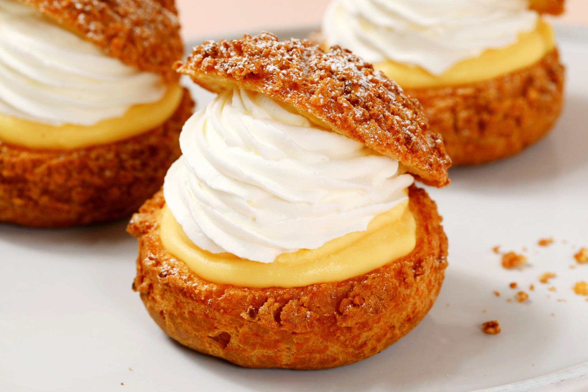 リームを2倍にしました。サクッと香ばしく焼き上げたシュー生地を半分にカットし、カス