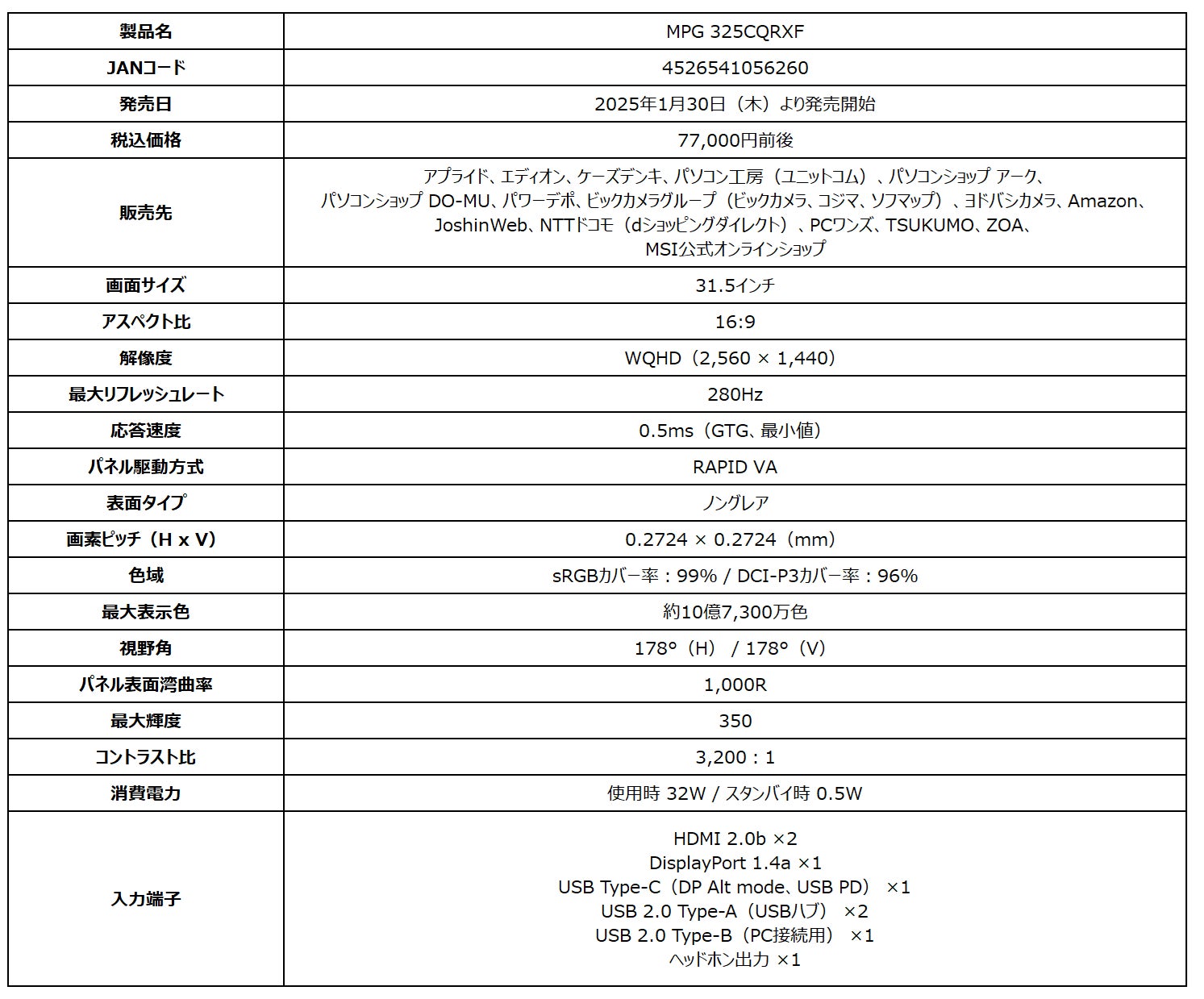 製品ページ:https://jp.msi.com/Monitor/MPG-325CQRXF