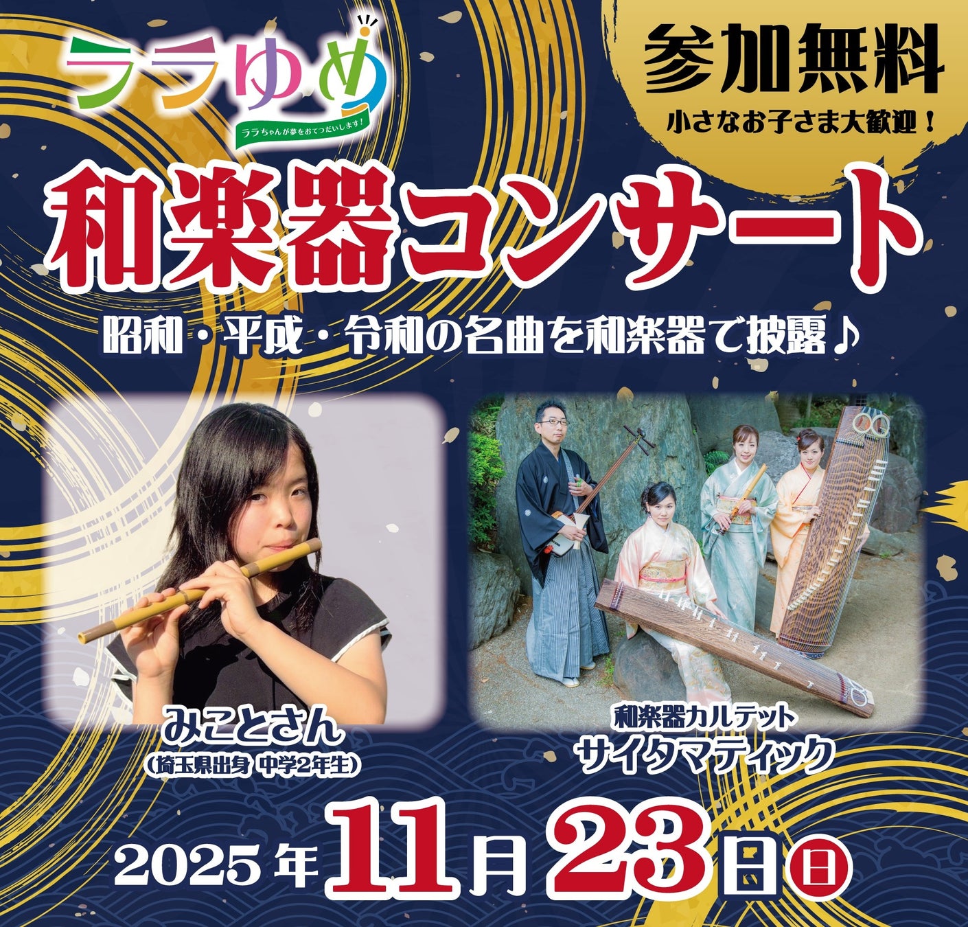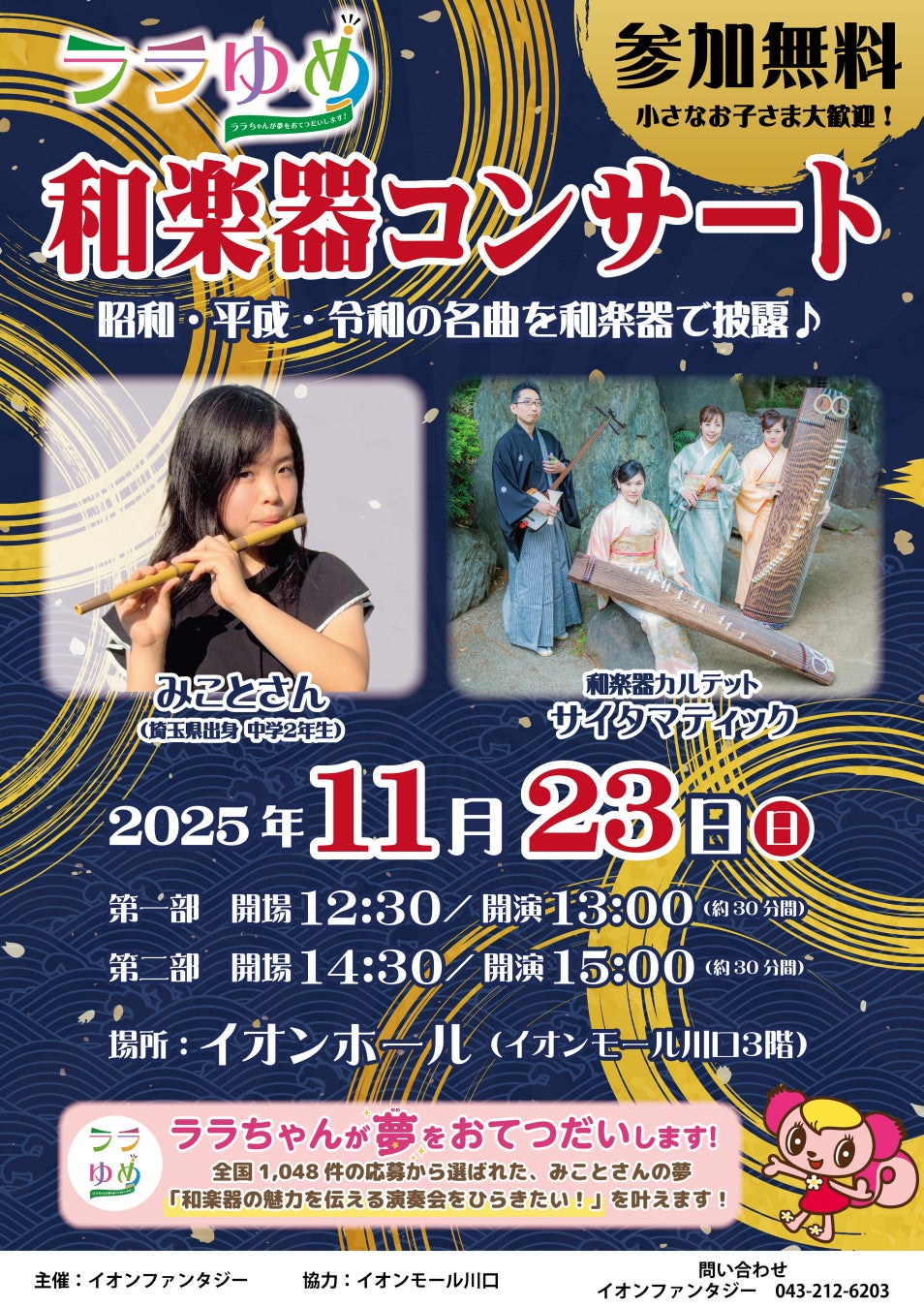 株式会社イオンファンタジー(代表取締役社長:藤原徳也、所在地:千葉県千葉市、以下、当社)は、「夢」を応援する社会貢献活動「ララゆめ ~ララちゃんが夢をおてつだいします!~」において、埼玉県越谷市在住のみことさん(13歳)の夢「和楽器の魅力を伝える演奏会をひらきたい」を実現します。このたび、イオンモール川口のご協力をいただき、2025年11月23日(日)にイオンモール川口にて、みことさんがプロの和楽器カルテット「サイタマティック」と共演する「和楽器コンサート」を開催します。