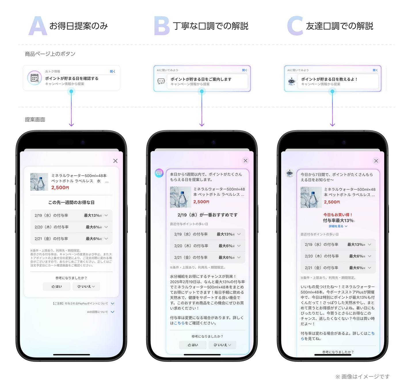 また、本機能が表示されるユーザーの中でも、おトク日の提案時に生成AIによる解説がない場合や、生成AIによる解説が付く場合も丁寧な口調か、友達同士で会話するときのようなくだけた口調かなど複数のパターンを検証したところ、“丁寧な口調で、おトク日の提案時に生成AIによる解説のあるパターン(下記画像B)”が最も反響が良いという結果になりました。