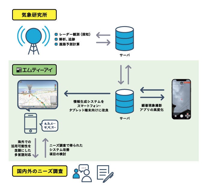 さらに、日本同様竜巻が多い海外で利活用されることで、竜巻や局地的大雨による被害軽減につなげられる可能性も見据え、スマートフォンアプリの多言語化対応や海外地図上で竜巻データを表示する機能などの開発を行い、ニーズ調査※3につなげます。