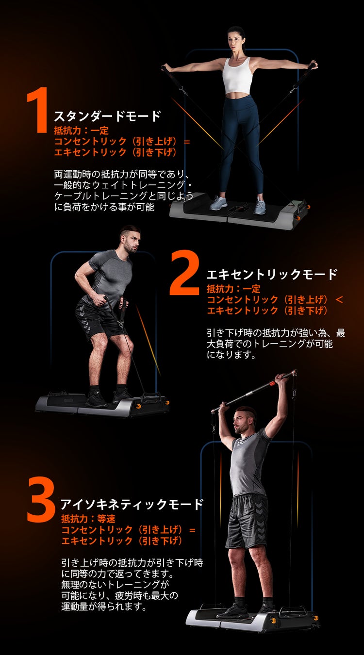 さらに、3種のトレーニングモードが搭載されており、多様な負荷調整が可能になることで、より本格的なトレーニングが可能となります。