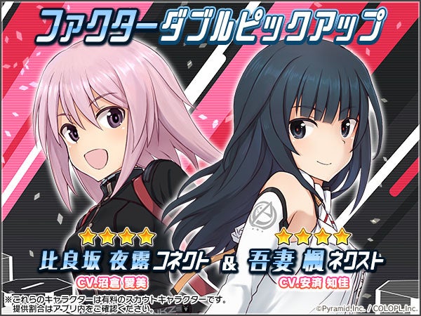「無料★4確定スカウト」や「プレミアムセレクトスカウト」の他にも、新コスチュームや新録ボイスが追加された「比良坂 夜露【コネクト】(CV:沼倉 愛美)」と「吾妻 楓【ネクスト】(CV:安済 知佳)」の★4ファクターキャラクターの登場など、様々なキャンペーンを実施中です。