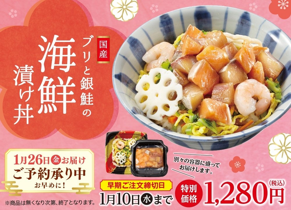 「ワタミの宅食」では季節や行事を感じていただけるよう、数量限定で特別弁当の販売を行っており、2023年度は年間4回の販売を予定しております。今回販売しております「海鮮漬け丼」は、1月26日(金)にお届けをします。国産のブリと銀鮭を使用し、エビやレンコン・錦糸玉子などと一緒に召し上がっていただく、新春にぴったりの商品です。「ワタミの宅食」では、日々の高齢者の食生活をサポートするだけでなく賑やかな食卓も提供してまいります。