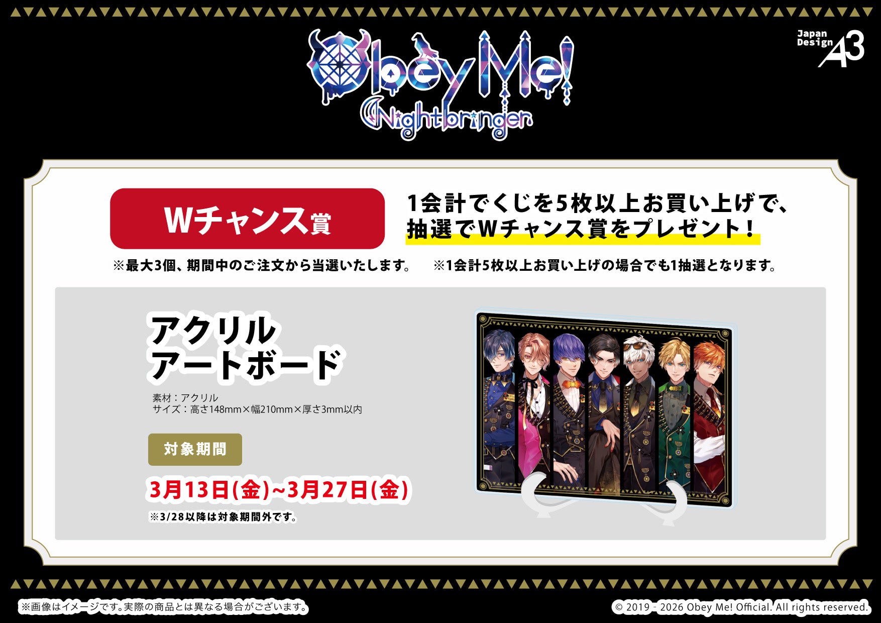 2026年3月13日(金)~3月27日(金)の対象期間中に、『Obey Me! Nightbringer』の「eeoくじ」を購入すると抽選に参加できる“Wチャンス賞”。