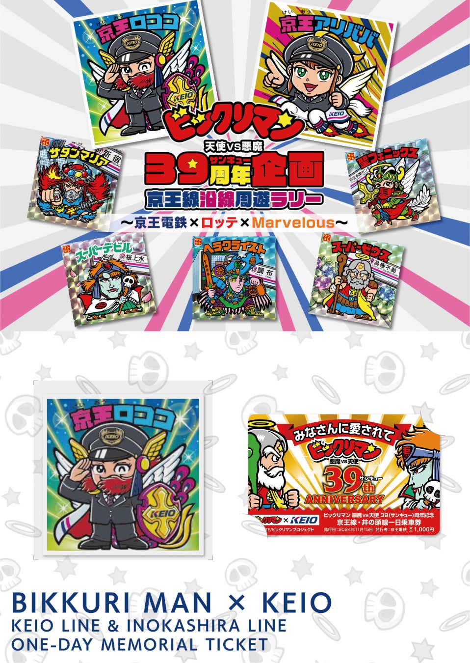 当企画では、ビックリマン×京王電鉄のオリジナルデザインを施した「カード台紙」、「京王線・井の頭線一日乗車券」、「描き下ろしBIGシール」の3点セットを「ビックリマン 悪魔VS天使 39(サンキュー)周年記念乗車券(以下、「記念乗車券」)」として数量限定で発売するほか、京王線新宿駅や調布駅など計5駅に設置されたラリースポットのQRコードを読み込むことで、マーベラスが運営するスマートフォン向けゲームアプリ「ビックリマン・ワンダーコレクション(以下、「ワンコレ」)」内でデジタルシールが貰える「沿線周遊ラリー」を実施します。また、京王線では車両1編成の車内ポスターをビックリマン一色に染めた「ビックリマントレイン」を運行します。さらに、「ワンコレ」内における京王電鉄と期間限定コラボイベントや、京王食品株式会社(本社:東京都多摩市、代表取締役社長:加野 智子)が運営するベーカリーショップ「Le repas(以下「ルパ」)」とのコラボパンの販売も実施します。