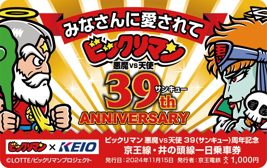 京王電鉄株式会社(本社:東京都多摩市、代表取締役社長 社長執行役員:都村 智史、以下「京王電鉄」)は、株式会社ロッテ(本社:東京都新宿区、代表取締役社長 執行役員:中島 英樹、以下「ロッテ」)および株式会社マーベラス(本社:東京都品川区、代表取締役社長:佐藤 澄宣、以下「マーベラス」)と「ビックリマン悪魔 VS 天使 39(サンキュー)周年企画 京王線沿線周遊ラリー(以下、「当企画」)」を11月15日(金)から11月30日(土)まで実施します。