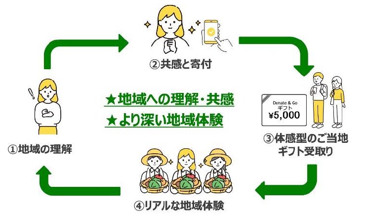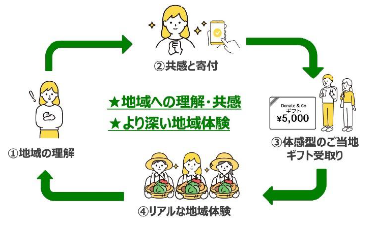 「Donate & Go」は、訪日客が訪れた地域で単なる観光消費を行うだけでなく、地域の歴史、文化、自然環境、景観を守り、育てるための寄付を募り、お礼の品として地域の加盟店や観光施設で利用できる体験型のご当地ギフトを受け取ることができる取り組みです。訪日客にリアルな地域体験を通じて地域の価値や魅力を知っていただくことで、地域の文化や環境の保全・振興に関わる関係人口となることを目指します。
