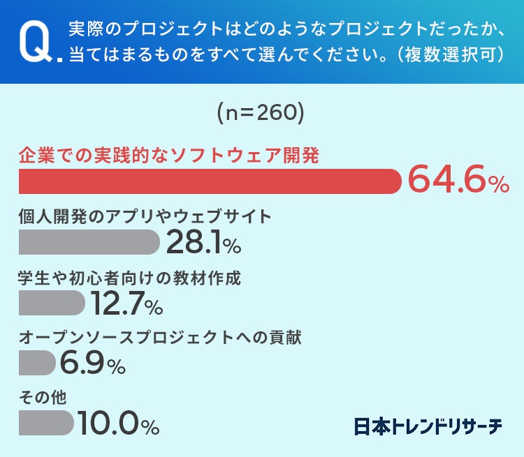 64.6%と半数以上の方が「企業での実践的なソフトウェア開発」に携わっていた、と回答しています。