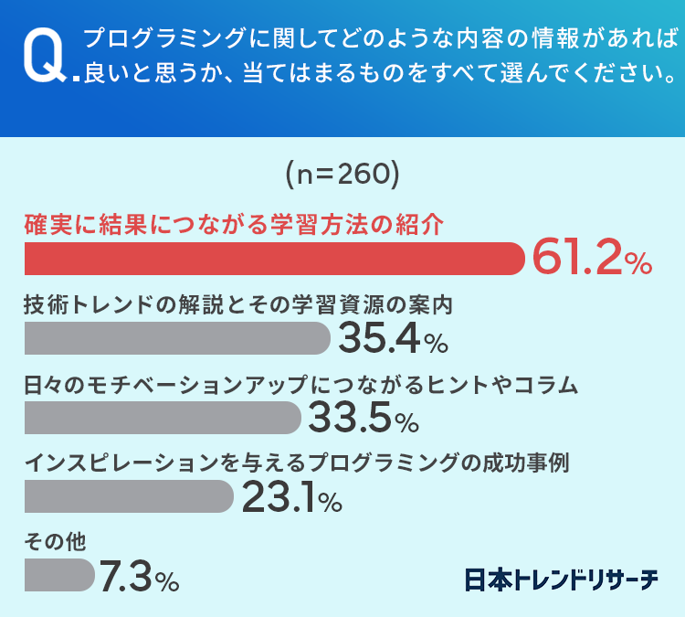 プログラミングの学習を成果に繋げるのがいかに大変かを思わせる結果といえるかも知れません。