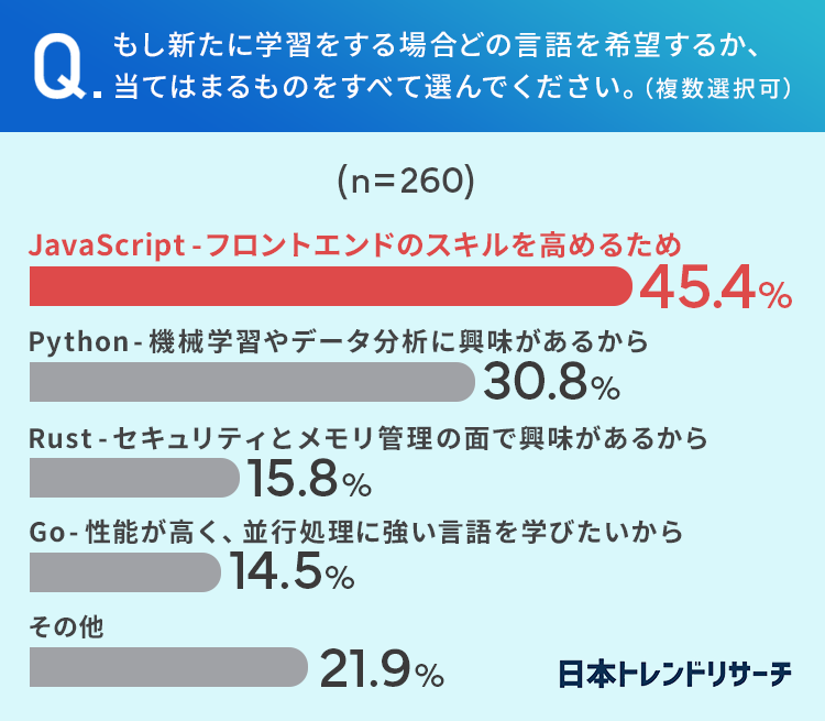 45.4%の方が、新たに学習するプログラミング言語として「JavaScript」を選んでいました。