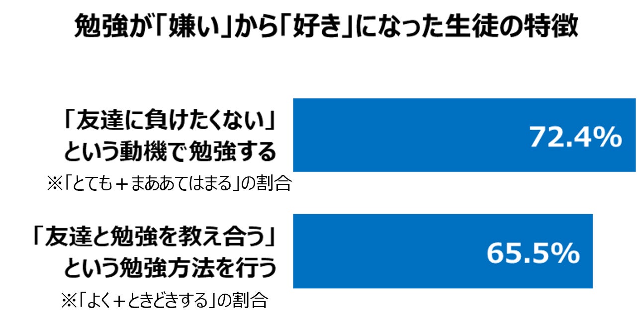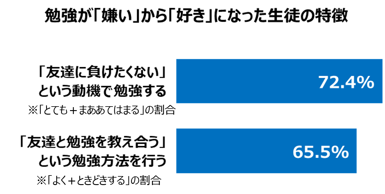 先述の東京大学とベネッセの共同研究プロジェクトの調査において、勉強が「嫌い」から「好き」になった生徒の特徴にも傾向が判明しました。勉強が「好き」に変わった生徒は、7割以上が「友達に負けたくないから」ということが学習動機の1つになっており、6割以上が「友達と勉強を教え合う」という学習方法を取っています。本学習ソフトは、子どもにとって身近なデバイスであるNintendo Switchで学習できるだけでなく、「みんなで学ぶ」モードを搭載しており、「友達と競い合う」「友達と教え合う」という要素が組み込まれているため、子どもたちの学習意欲向上を支援することが可能です。