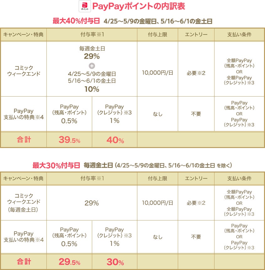 4月25日(金)から5月19日(月)に開催した25周年記念企画の好評を受け、さらに本日5月23日(金)から5月25日(日)、5月30日(金)から6月1日(日)の間、PayPayポイントの最大付与率が通常よりさらに10%プラスとなる「コミックウィークエンド最大40%付与」キャンペーンを追加開催します。通常の「コミックウィークエンド」では最大30%付与のところ、本期間内に購入すると、最大40%の付与となります。「コミックウィークエンド最大40%付与」キャンペーンで、いつもよりさらにお得な週末をお楽しみください。