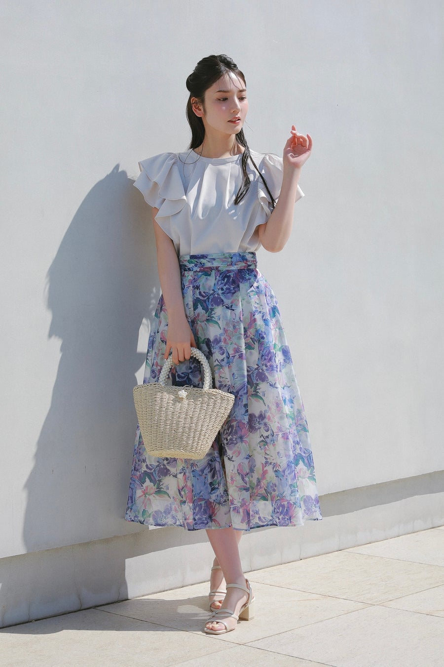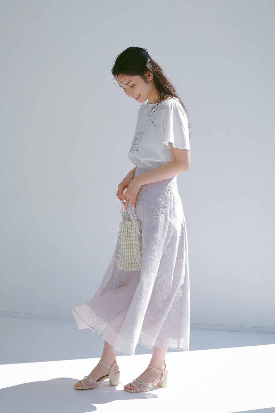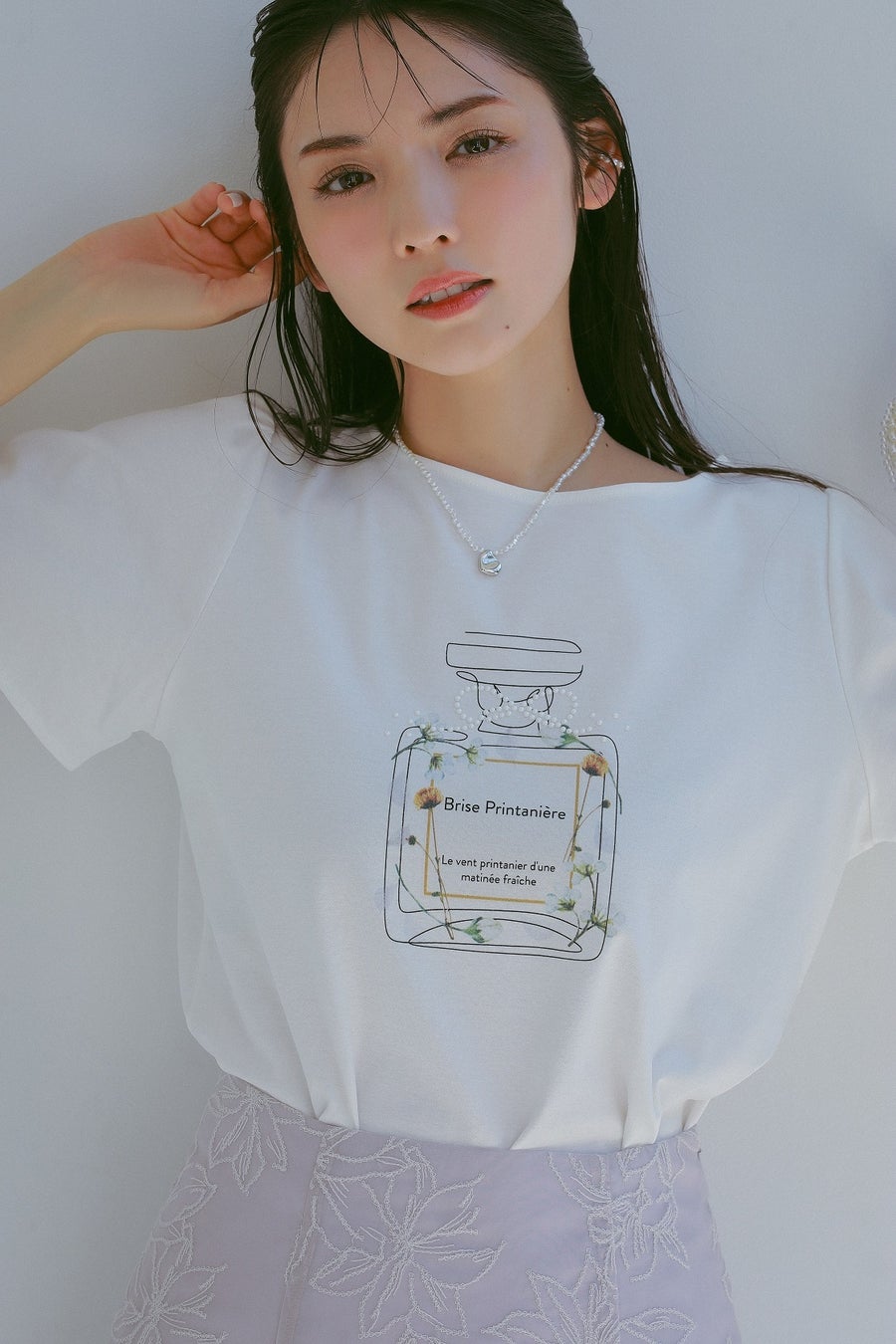 クチュールブローチがおすすめする夏のシアーアイテムをラインナップした今回の特集ページでは、毎年大人気の香水瓶のTシャツや凹凸のあるシアーな素材にサマーフラワーのプリントを施したスペシャルワンピース、オリジナルプリントのオーガンジースカートなど、この夏イチオシのコレクションを道重さんが素敵に着こなしています。
