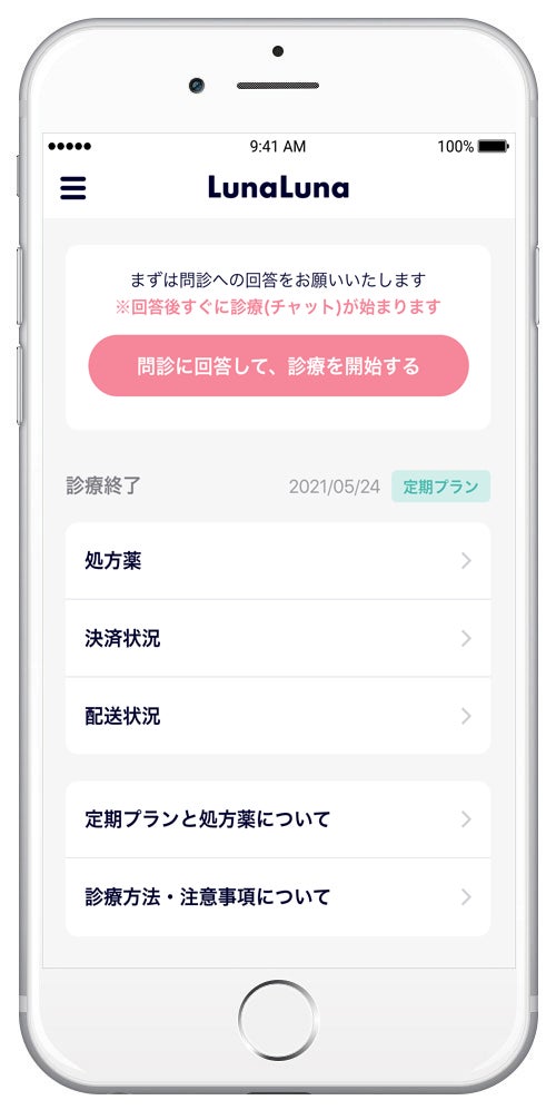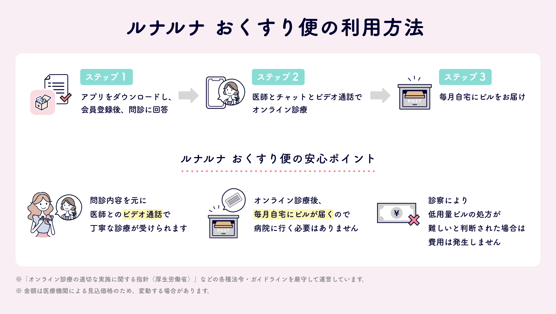※『ルナルナ おくすり便』は、医療機関とユーザーとの間でのオンライン診療を実現するプラットフォームです。実際の診療・薬剤の処方と発送は医療機関および医師が行います。