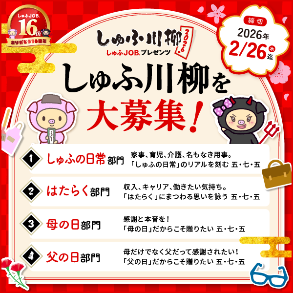 ビースタイルグループで求人サイト『しゅふJOB』を運営する株式会社ビースタイルメディア(本社:東京都新宿区、代表取締役社長:石橋聖文)は、「しゅふJOBプレゼンツ しゅふ川柳」の作品募集を開始します。募集期間は2026年2月2日(月)~2月26日(木)です。その後、3月12日(木)~4月8日(水)に一般投票を実施し、4月に各部門の入賞作品を発表します。