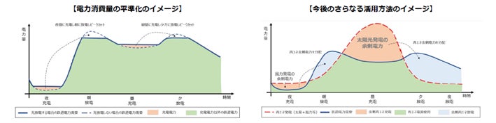 平常時は鉄道の電力需要が高い朝・夕のラッシュ時間帯に蓄電池から放電し、時間帯によって増減する電力消費量の平準化、電力コストの低減を図ります。