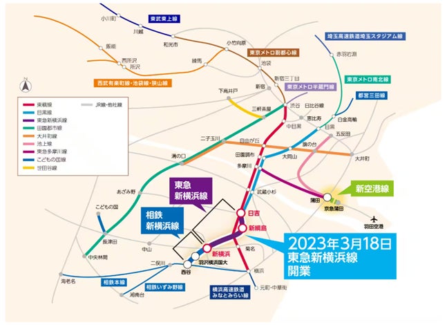 東急電鉄では創業以来、鉄道ネットワークの拡充と強化に取り組み続けています。2023年3月18日に「相鉄・東急新横浜線」が開業、相鉄線との相互直通運転がはじまると共に、新横浜駅から渋谷駅まで乗り換えなしで移動できるようになり、新幹線アクセスの強化が実現しました。また、東急線から羽田空港へのアクセス利便性を向上する新空港線計画も推進中です。新空港線は、東横線、東京メトロ副都心線、東武東上線、西武池袋線との相互直通運転を通じて、国際競争力強化の拠点である渋谷、新宿、池袋や東京都北西部・埼玉県南西部と羽田空港とのアクセス向上が期待されます。