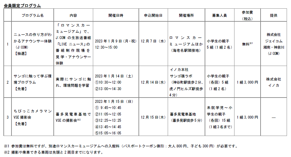 お子さまの成長を応援する体験型イベントでは、月額会員限定で定期開催するイベントへお申し込みいただけるほか、広く募集する当社主催のファミリー向けイベントの一部で、先行予約や優待価格を適用いただけます。サービスイン時点の限定イベントでは、「ニュースの作り方がわかるアナウンサー体験(J:COM)」や「サンゴに触って学ぶ環境プログラム」、「ちびっこカメラマンVSE撮影会」を実施します。ロマンスカーミュージアムでのレポートが実際にJ:COM「LIVE ニュース」で生放送される体験のほか、イノカ・サンゴ礁ラボにてサンゴなどに触れながら環境問題を学べるなど成長を後押しするイベントや、ロマンスカー・VSE(50000形)を被写体に未就学児にも参加いただける親子で楽しめる撮影会を予定しています。2月以降もさまざまなパートナーとプログラムを開催していきます。