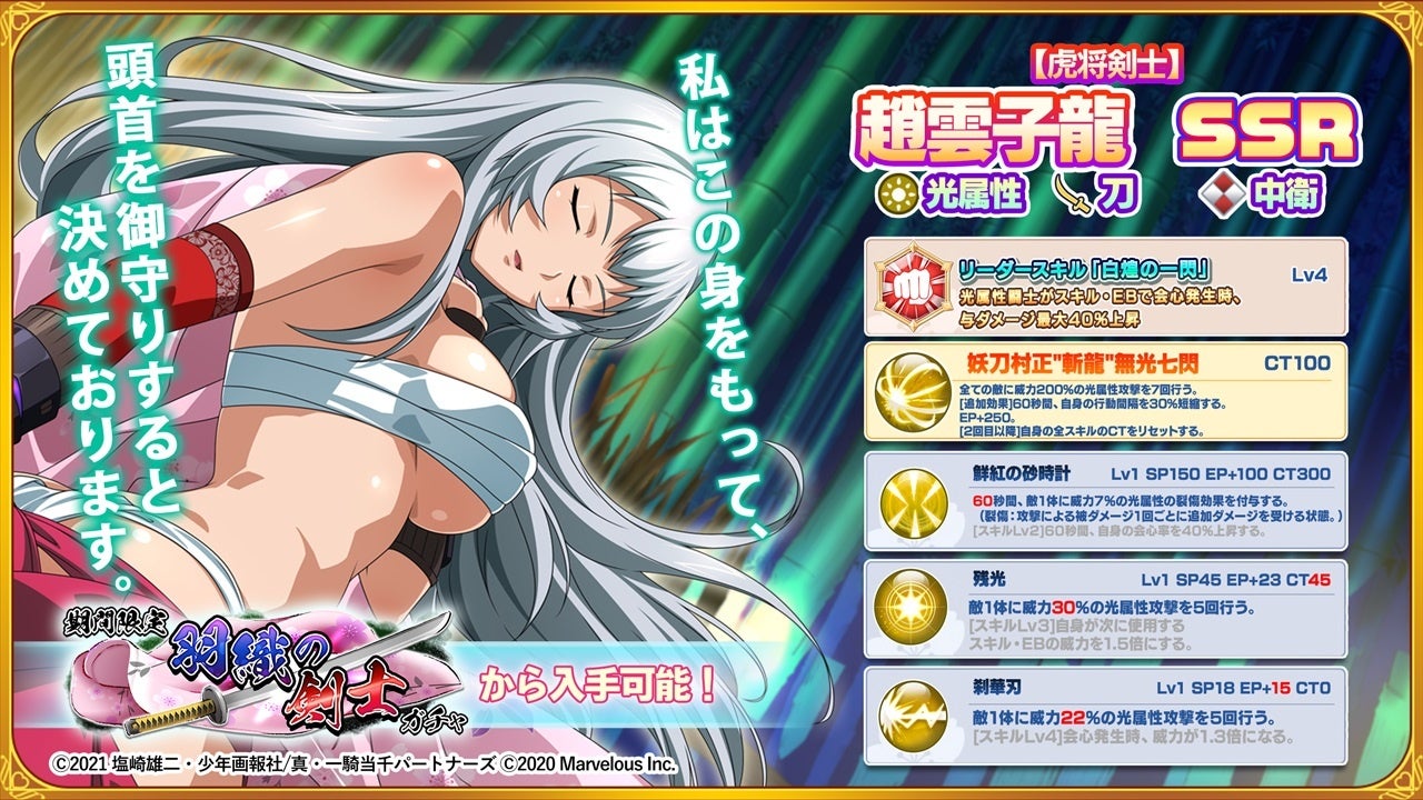 権利表記 :(C) 2019 塩崎雄二・少年画報社/一騎当千WWパートナーズ (C)2020 Marvelous Inc.