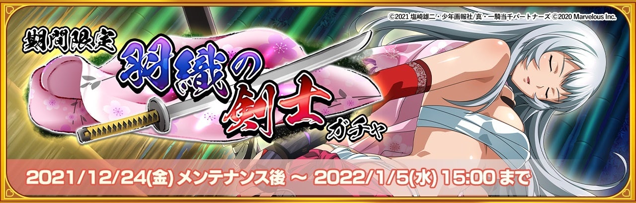 株式会社マーベラス(代表取締役社長 許田周一/所在地:東京都品川区)は、原作が20周年を迎えた大人気シリーズ「一騎当千」のAndroid/iOS向け新作ゲームアプリ『一騎当千エクストラバースト』で、2021年12月24日(金)から、「バーストフェス」、及び、クリスマスプレゼントの配布や年越しログインボーナスを開始したことをお知らせいたします。