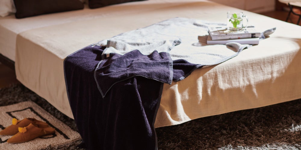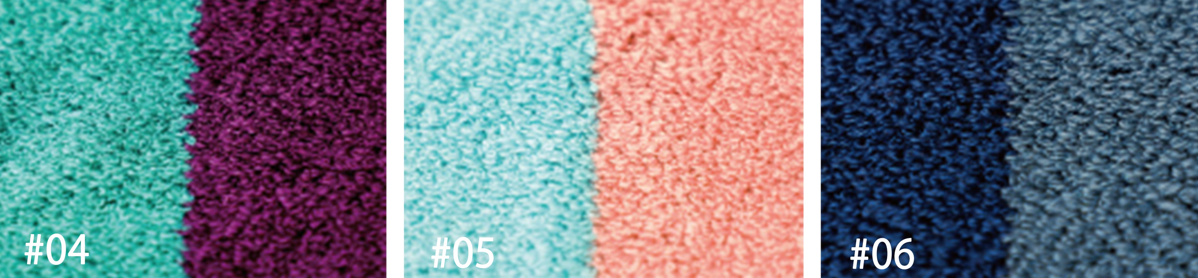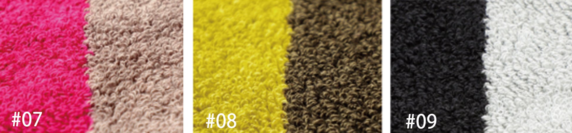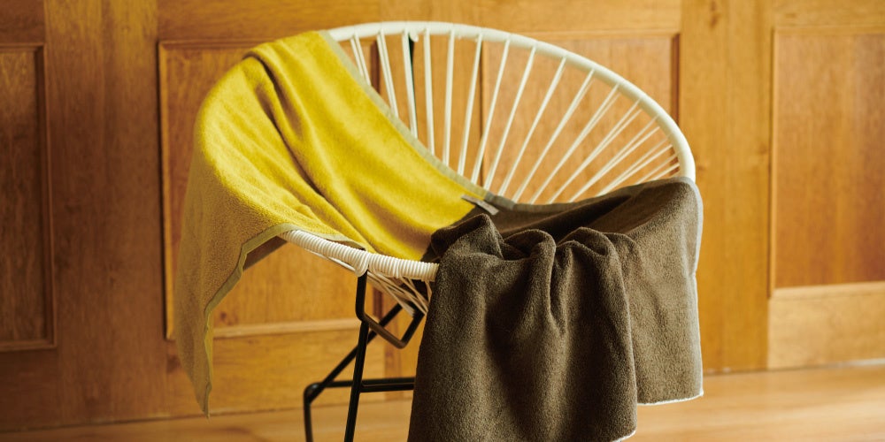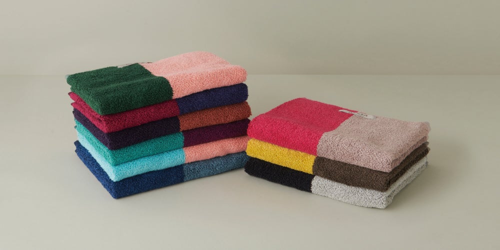 2Couleurs (ドゥコロール)とは、ツートンという意味のフランス語。表と裏の色を同じに織り上げることで、掛けて使う時に色が混じらずシャープな印象になります。バンブーレーヨンと綿の糸の染まり具合の差を利用することによって、同色の中に光沢感と深みのあるカラーを実現した2色使いにし、テーマである様々な『Love』を表現しました。パイルに織り交ぜてあるバンブーレーヨンは、綿よりも吸水性が高いとされ、それによりボリュームがありながらもさらりとした拭き心地を実現。サイズのバリエーションも豊富なので、海や、プール、キャンプ、などのアウトドアシーンに印象的なカラーが映えます。また、お部屋やバスルームに好きなカラーを重ねて置けば、インテリアとの相性も抜群です。