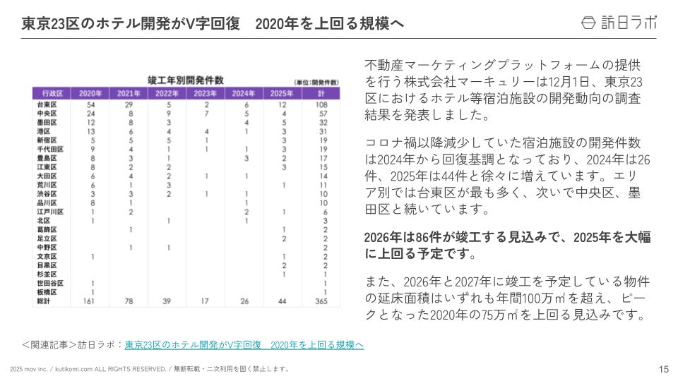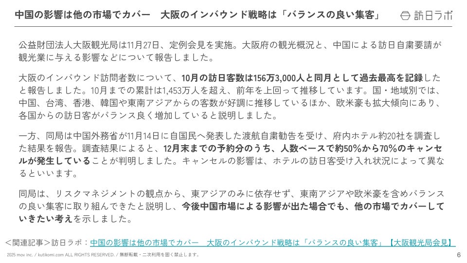 業界最大級のインバウンドビジネスメディア「訪日ラボ」及び 店舗向け集客一元化プラットフォーム「口コミコム」を運営する株式会社mov(代表取締役:渡邊 誠、本社:東京都渋谷区、以下mov)は、「インバウンドに関する最新トレンド・データ」「政府・自治体・企業などのインバウンド関連の取り組み」をはじめ、インバウンド対策に役立つニュースをまとめた「インバウンド情報まとめ【2025年12月前編】」を公開しました。