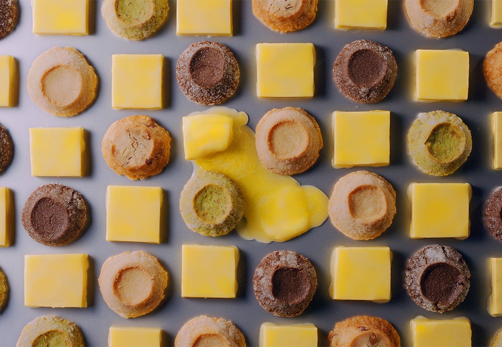1種類のバターでは飽き足らず、最高の香り・コク・こうばしさを求めて当店限定のトリプルブレンドバターを厳選配合しました。その特製バターを旧来の常識を超えた豊富な量でたっぷり生地に練り込んでいます(※)。封を切っただけでバターが匂い立つ究極のバターリッチクッキーの理由です。