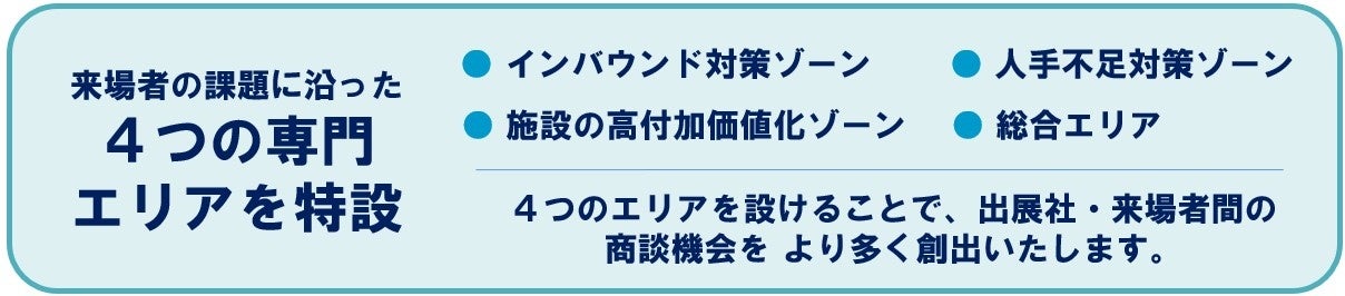 観光課題に関するソリューションが集結する商談展示会です。ホテル・旅館などの宿泊施設や自治体・観光協会・DMOなどが来場し、課題解決に向けた相談ができる場です。4つの専門エリアを設けることで、出展社・来場者間の商談機会をより多く創出いたします。