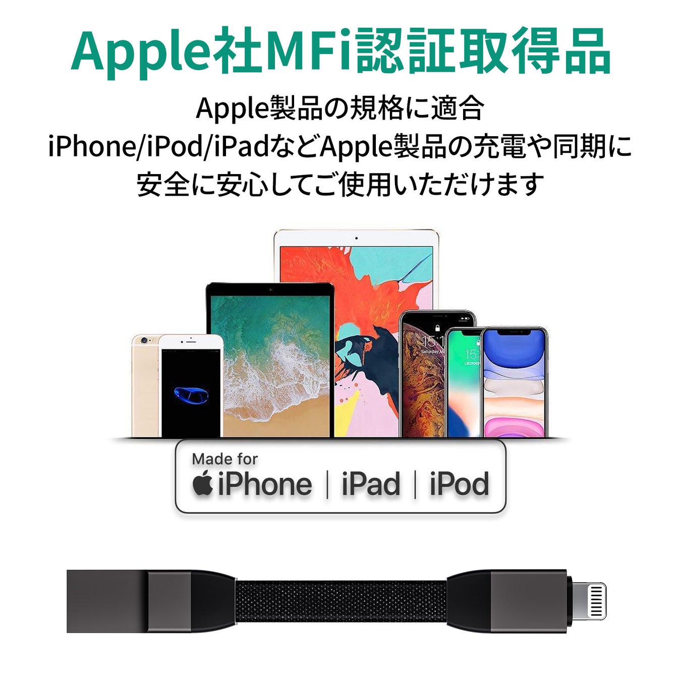 Lightningコネクターの2モデル(USB-A to Lightning / USB-C to Lightning)は、Apple製品の規格に適合しており、Apple製品の充電や同期に安心してご使用いただけます。