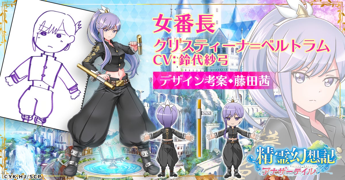 こんにちは!精霊幻想記アナザーテイル、クリスティーナ役の鈴代紗弓です。この度なんと!私達キャスト陣が考えた衣装が、ゲームに実装されることになりました。私が演じているクリスティーナは、セリア役の藤田茜さんが考えてくださった、短ラン姿でご登場です!私も一緒に衣装を考えさせていただいたときに「このクリスティーナちゃん、見たいな!」と思っていたので、まさか本当に実装していただけるとはという気持ちで、とても嬉しいです。特に「いいな!」と思ったのが、へそ出しと、漢字で書いてある袖の「譜炉羅(フローラ)」、背面の「瓶流都等夢(べルトラム)」というのがとてもカッコイイなと思っています。トンファーを持っていたりなど、妄想と夢が詰まった衣装になっているのがすごく素敵で、実装が楽しみだなと思っております。精霊幻想記アナザーテイル!キャスト陣の考えたドリーム衣装イベント第1弾を皆様も楽しみにしていただけたら嬉しいです。