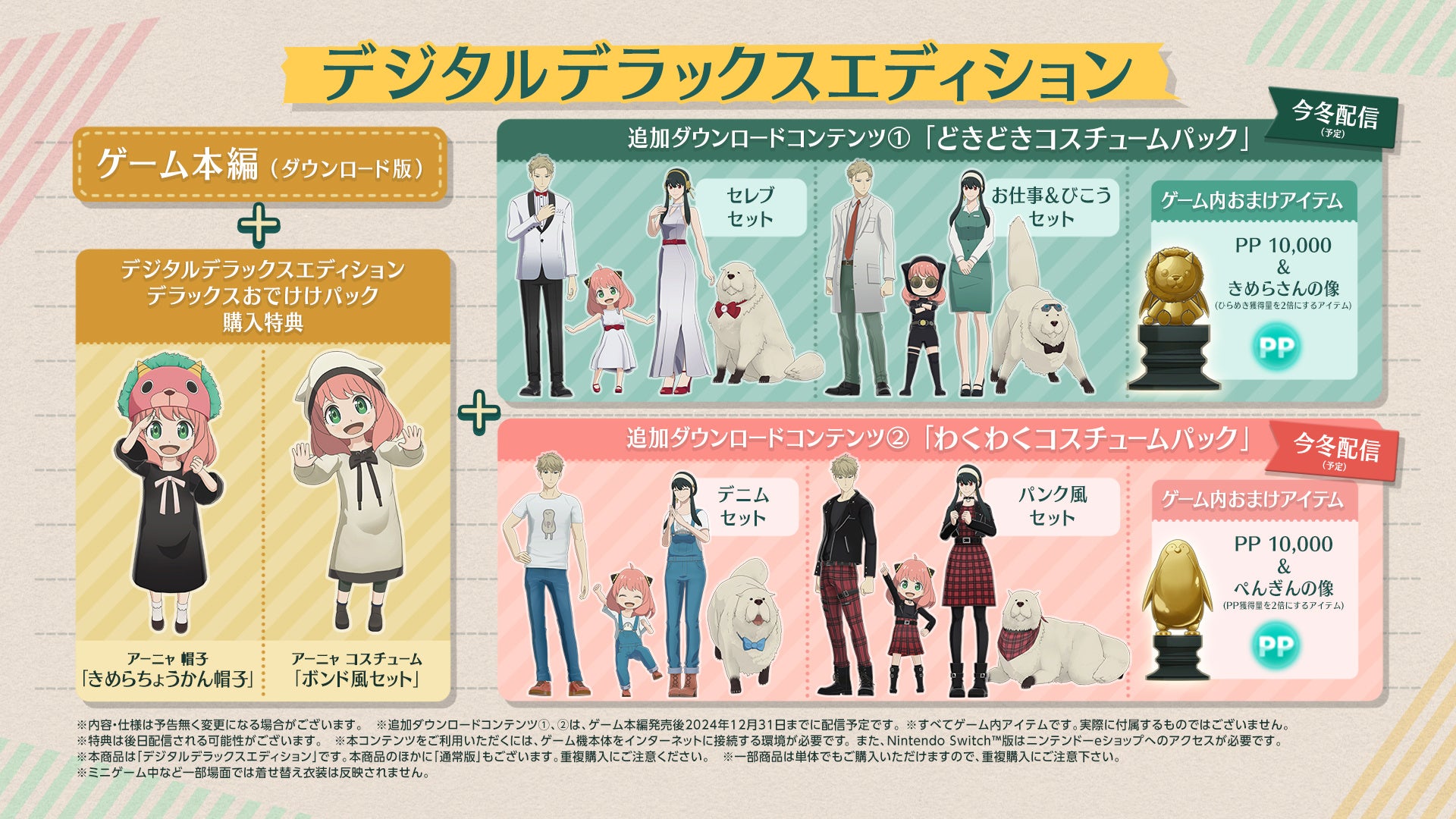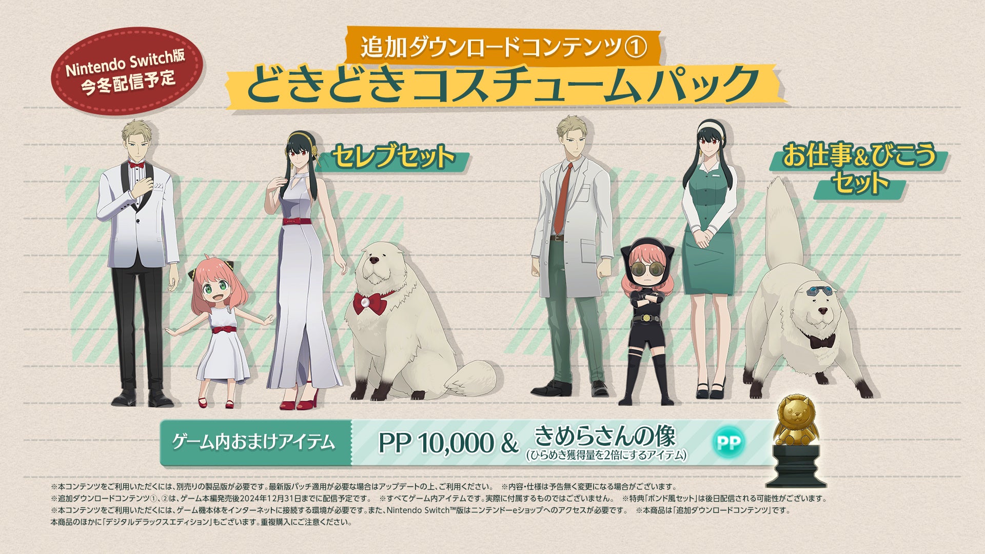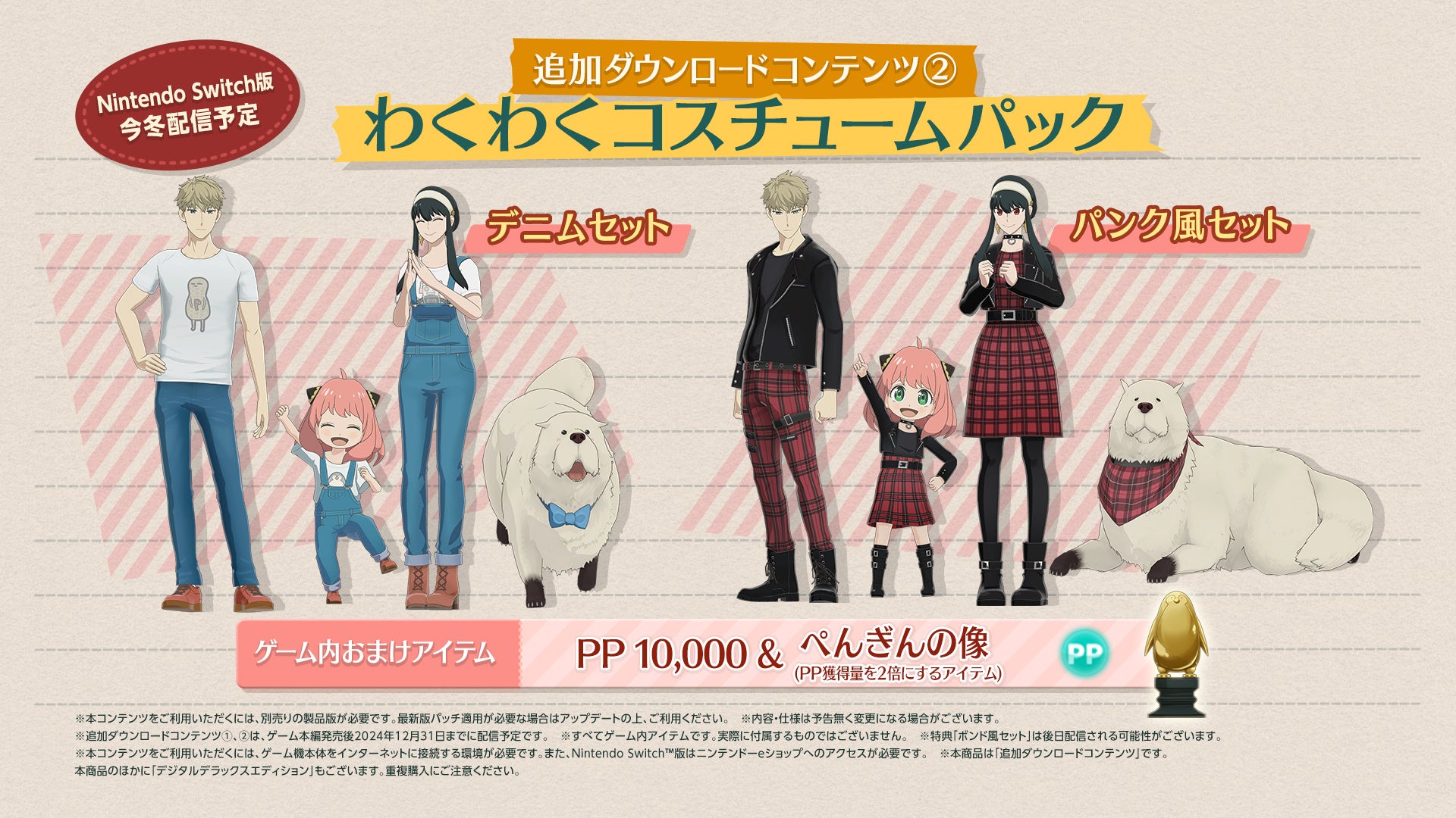 いずれのコンテンツも、フォージャー家のゲーム内コスチュームと、ゲーム内で使用できるアイテムがセットになった追加コンテンツとなっております。