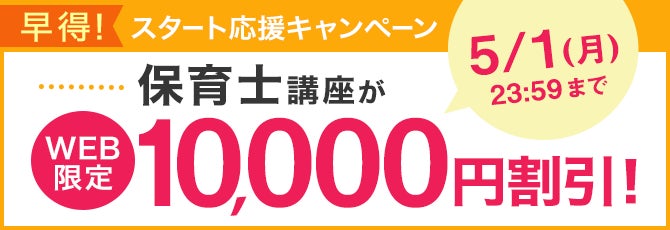 2023年5月1日(月)まで、WEBからの受講お申込み限定で保育士講座の受講料を10,000円割引いたします。