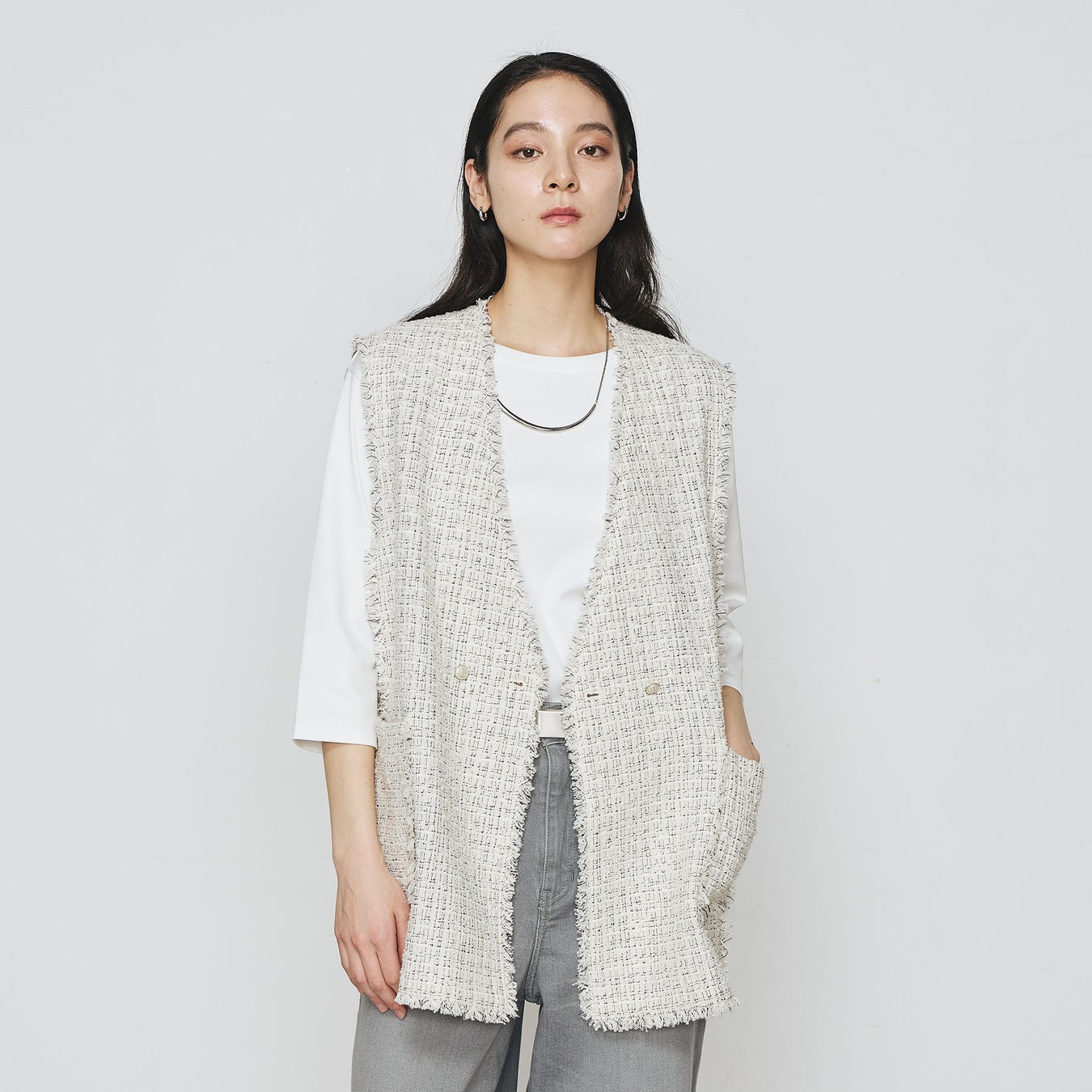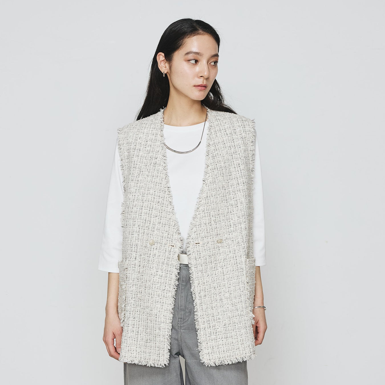 クラシカルディテールをプラスすることで、ジレという軽いアイテムでもグレード感を表現しました。
