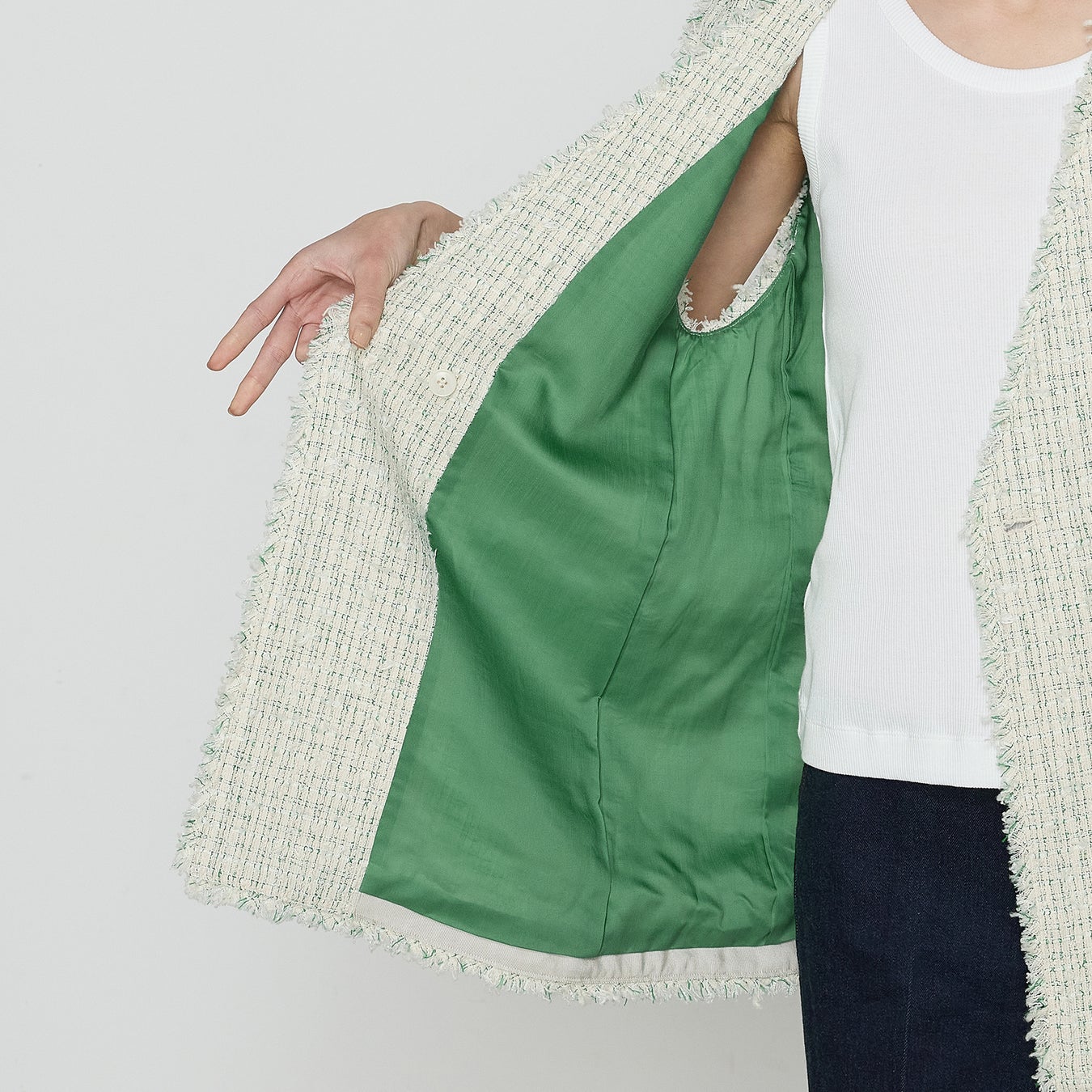 ツイードの生地感を活かすために、あえてシンプルなデザインにしました。生地に程良い厚みがるので、春の羽織としても着られます。