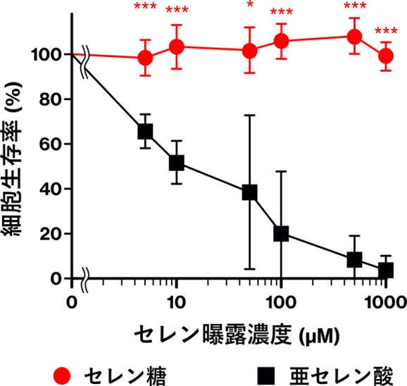 ヒト肝がん細胞(HepG2)を用いてセレン糖の細胞毒性試験を実施したところ、医薬品として使われている亜セレン酸(注4)が1 mMの濃度で24時間以内にほぼ100%の細胞を死滅させたのに対し、セレン糖はまったく細胞毒性を示しませんでした(図2)。したがって、セレン糖が生体にとって安全な化学形態であることが明らかとなりました。
